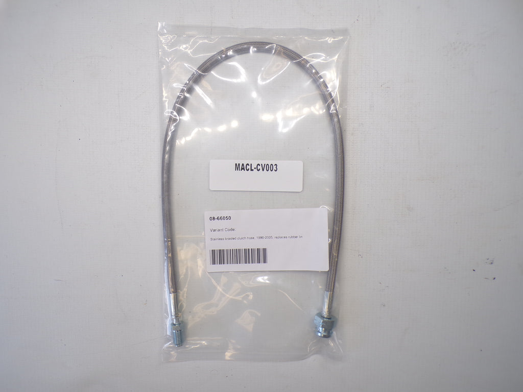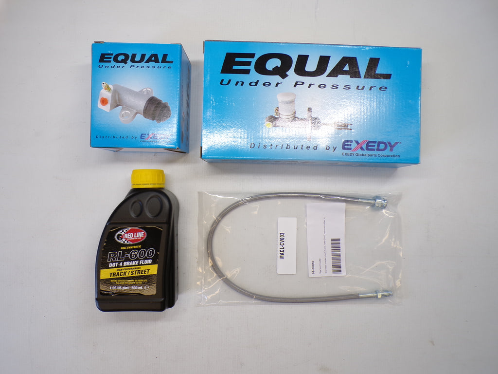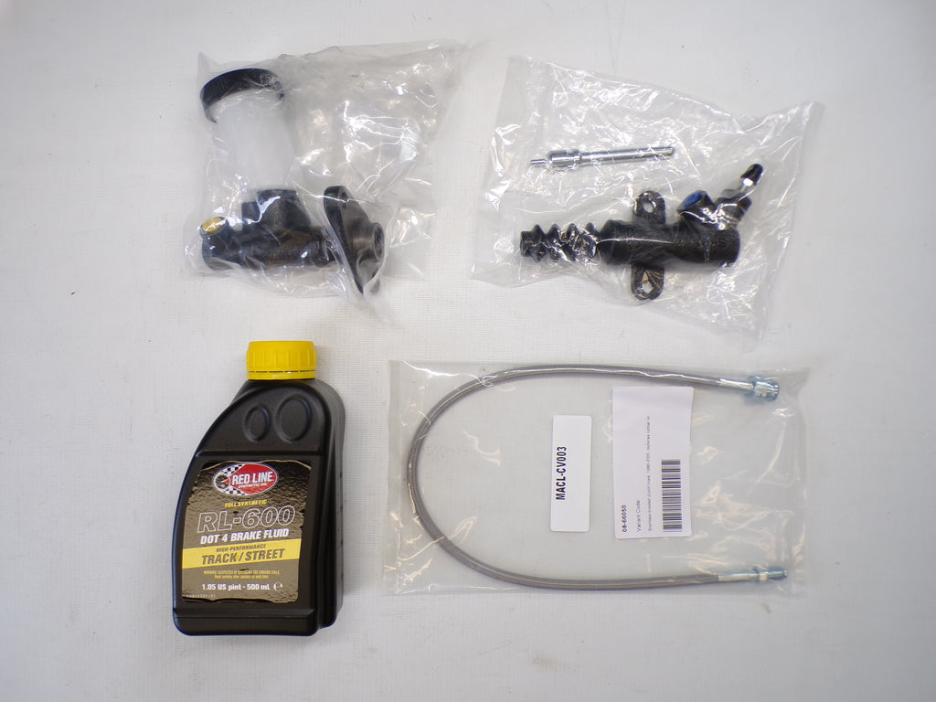 New Flyin' Miata clutch hydraulics refresh kit for NA and NB Mazda Miata. This kit includes a new clutch hydraulic master cylinder, a stainless steel braided hydraulic line to replace the factory rubber hose on the passenger side firewall, a new clutch hydraulic slave cylinder, and high temp Redline brake fluid. Fits 1990 with a Vin number higher than 111969 and 1991-2005 Mazda Miata with manual transmission. Does not fit 2004-2005 Mazdaspeed Miata.