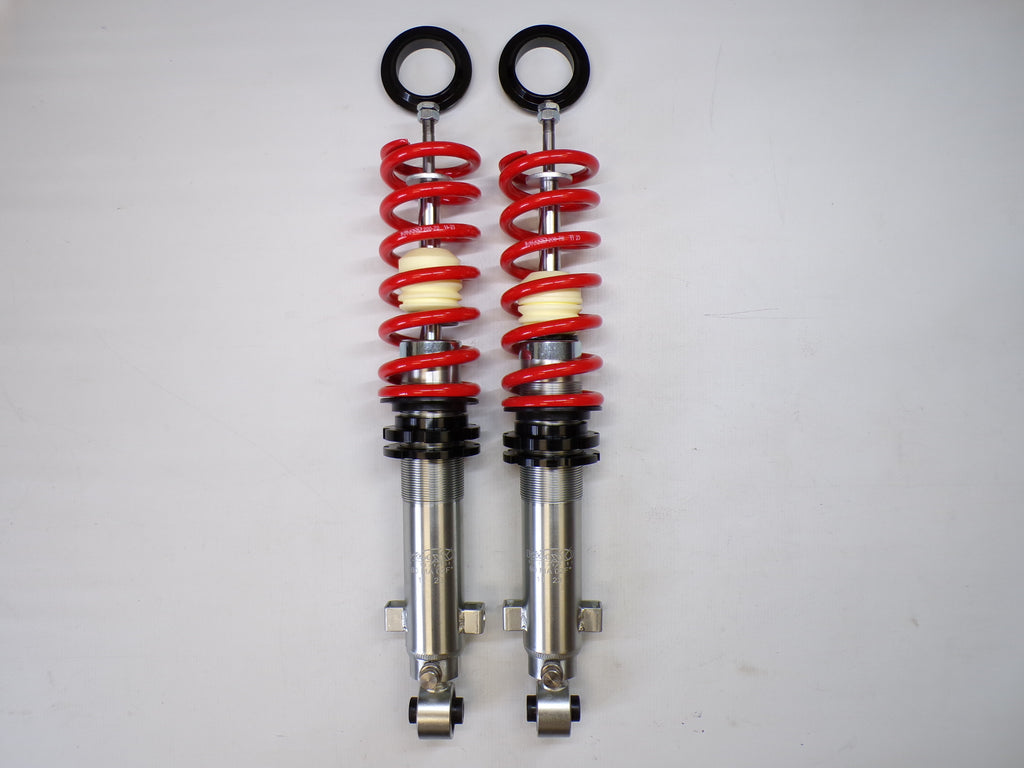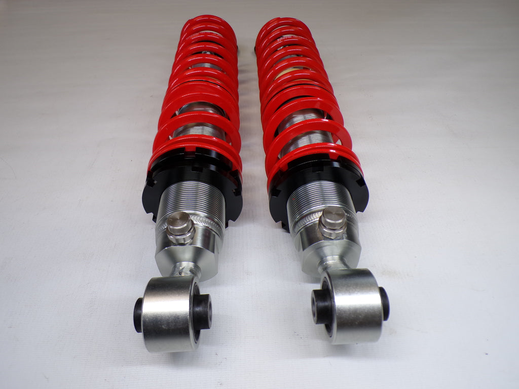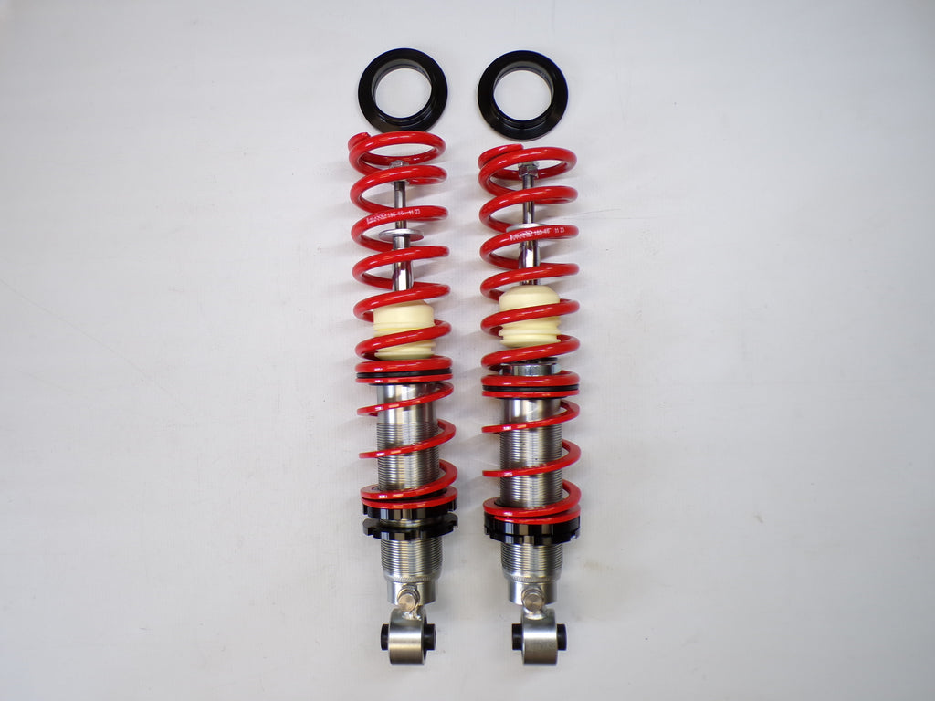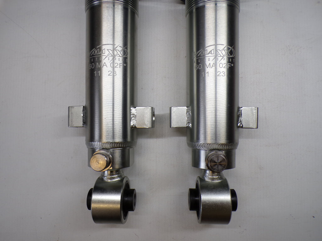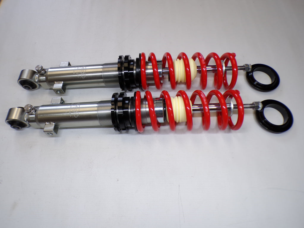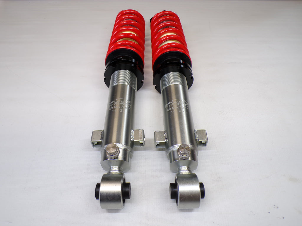 New aftermarket Flyin' Miata V-Maxx XXtreme Sport Coilover Kit for NB Mazda Miata. This coilover kit includes front and rear springs, four shocks, adjusting tools, and bumpstops. The shocks in the coilover kit have adjustable damping and an adjustable spring perch for full control over ride height and corner weighting. A 1/2" shorter rear shock body gives extra compression travel for improved ride and handling. The spring rates for XXtreme Sport coilovers are 391 lb/in in the front and 258 lb/in in the rear and are designed to be stiff enough for track and autocross use while being firm but useable on the street. The coilover kit does not include upper mounts as they are designed to work with the factory upper shock mounts. The Flyin' Miata V-Maxx XXtreme coilover kit comes with a two-year warranty. Fits 1999-2005.