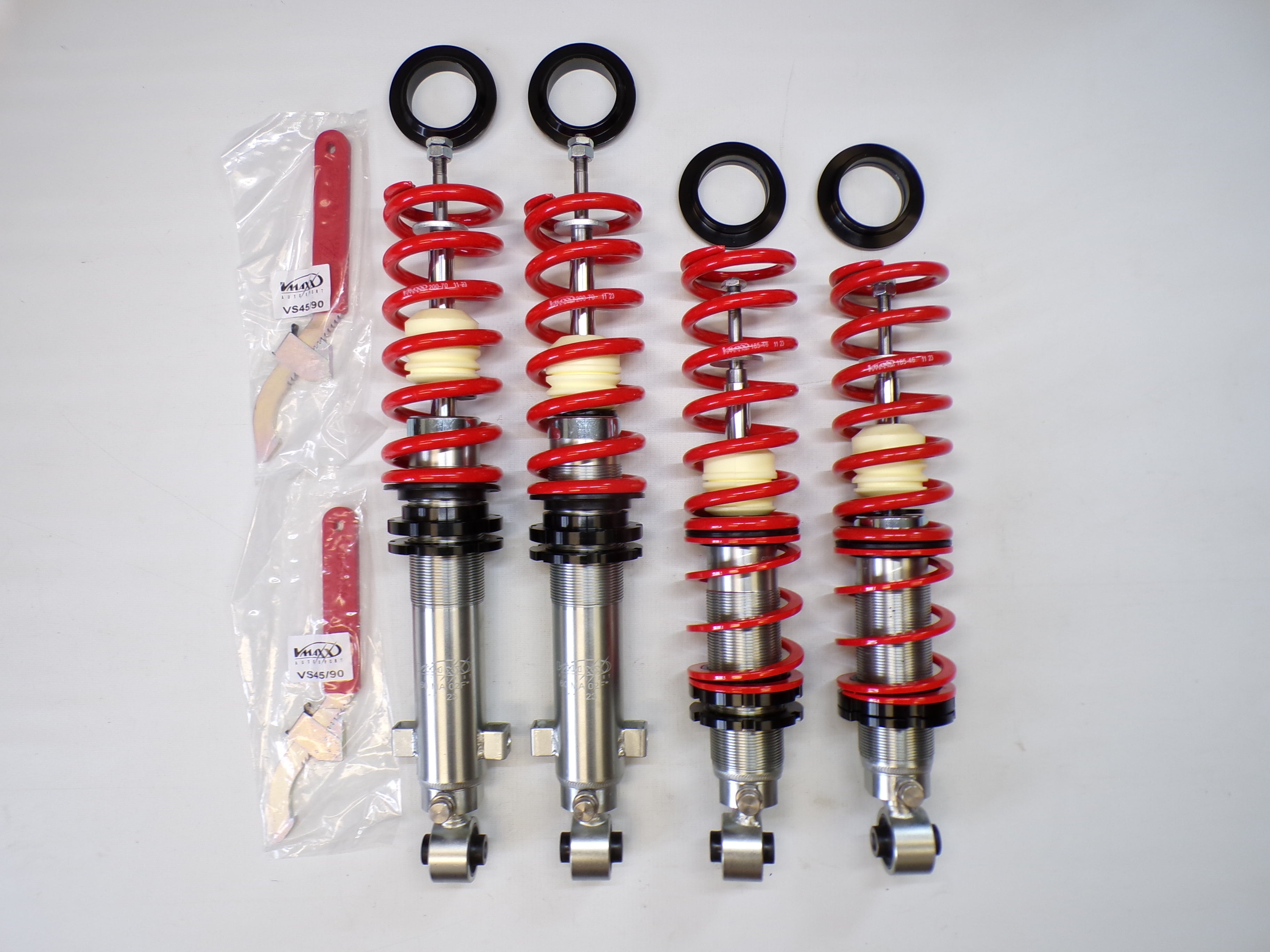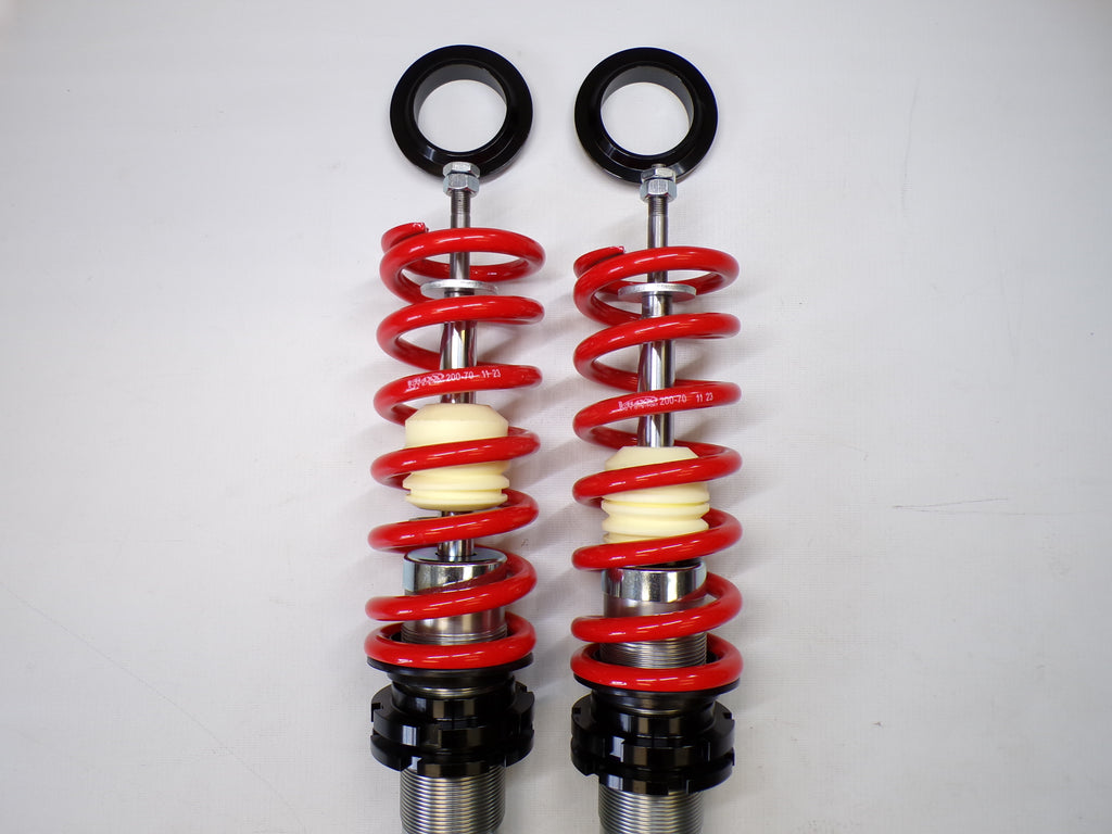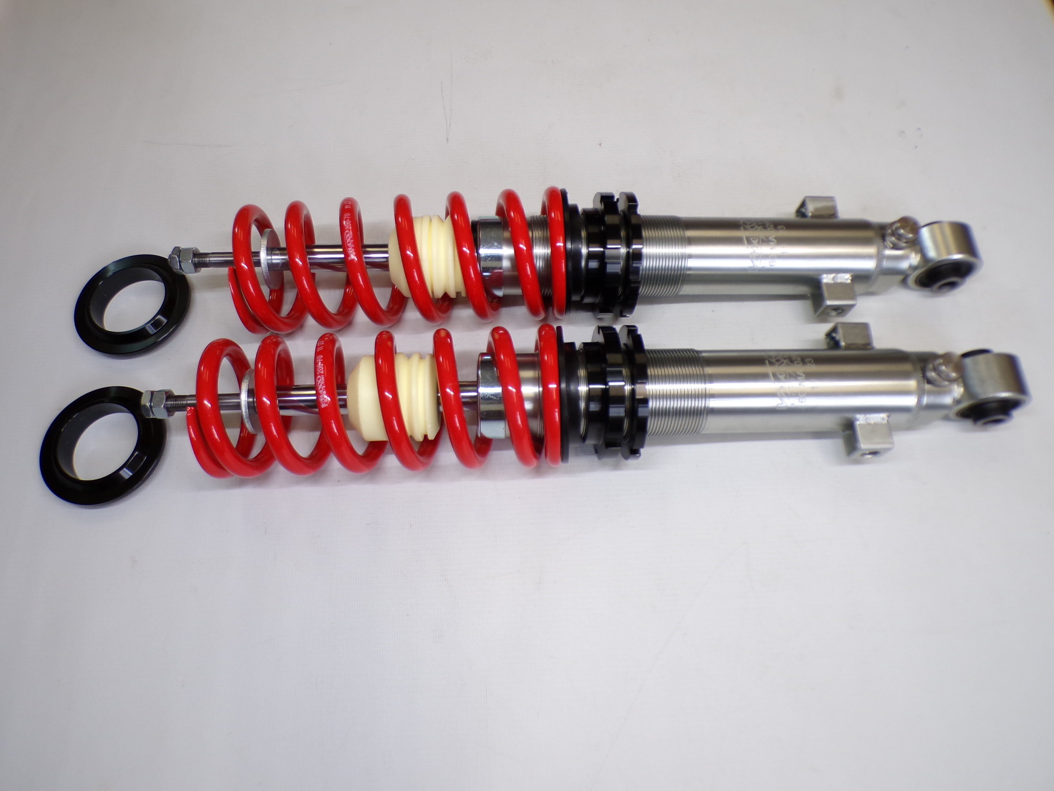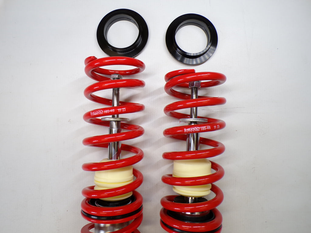 New aftermarket Flyin' Miata V-Maxx XXtreme Sport Coilover Kit for NB Mazda Miata. This coilover kit includes front and rear springs, four shocks, adjusting tools, and bumpstops. The shocks in the coilover kit have adjustable damping and an adjustable spring perch for full control over ride height and corner weighting. A 1/2" shorter rear shock body gives extra compression travel for improved ride and handling. The spring rates for XXtreme Sport coilovers are 391 lb/in in the front and 258 lb/in in the rear and are designed to be stiff enough for track and autocross use while being firm but useable on the street. The coilover kit does not include upper mounts as they are designed to work with the factory upper shock mounts. The Flyin' Miata V-Maxx XXtreme coilover kit comes with a two-year warranty. Fits 1999-2005.
