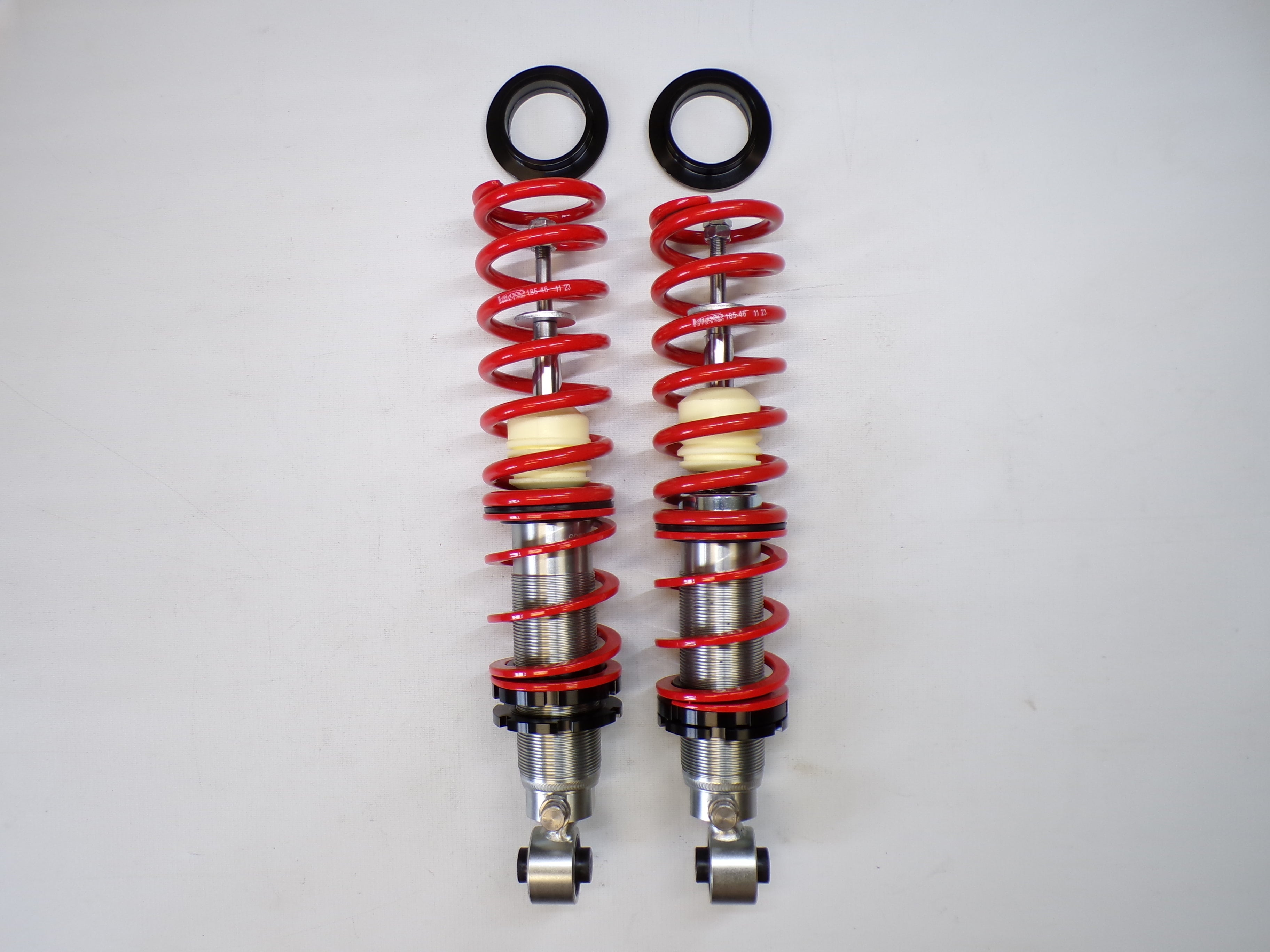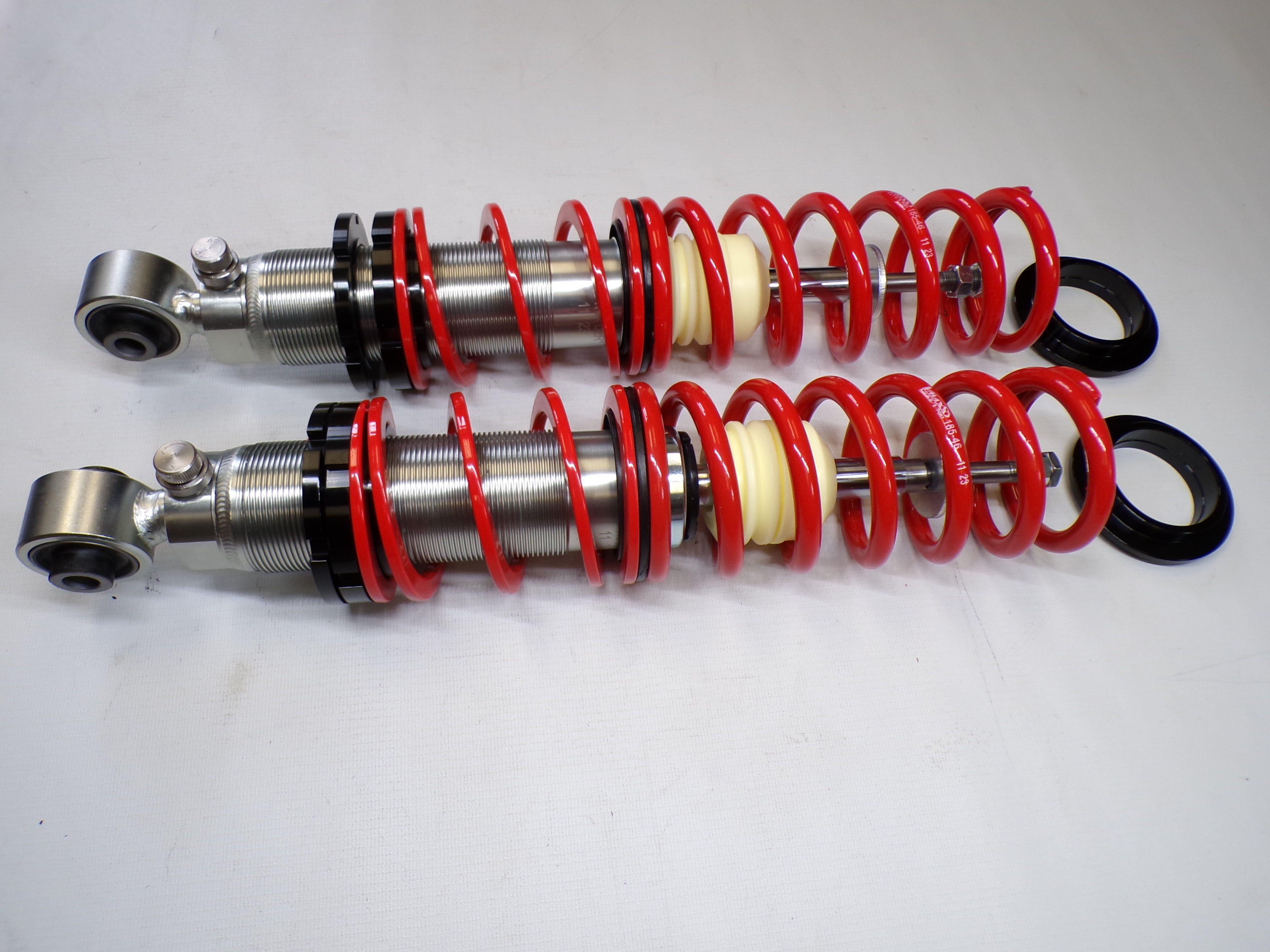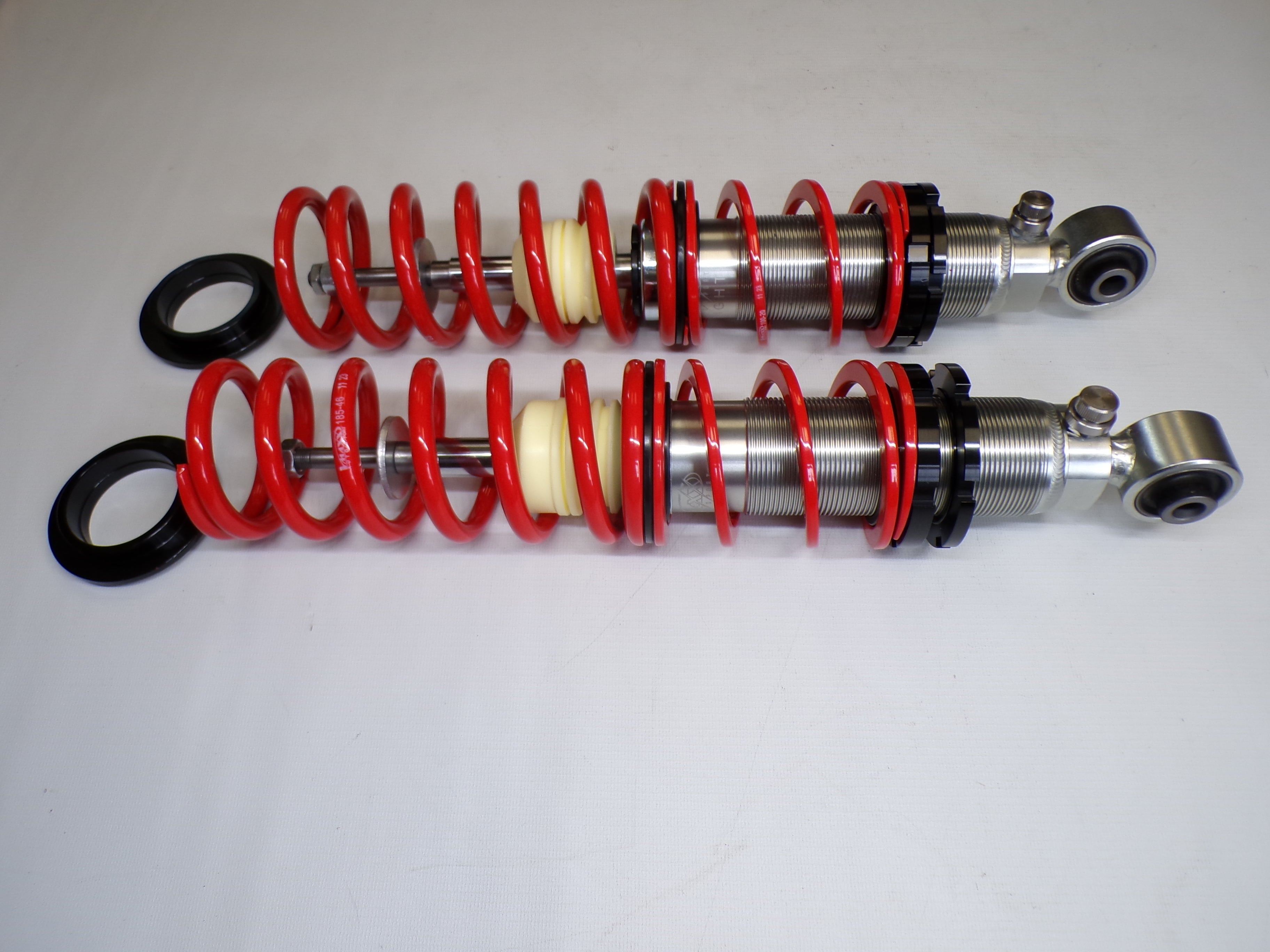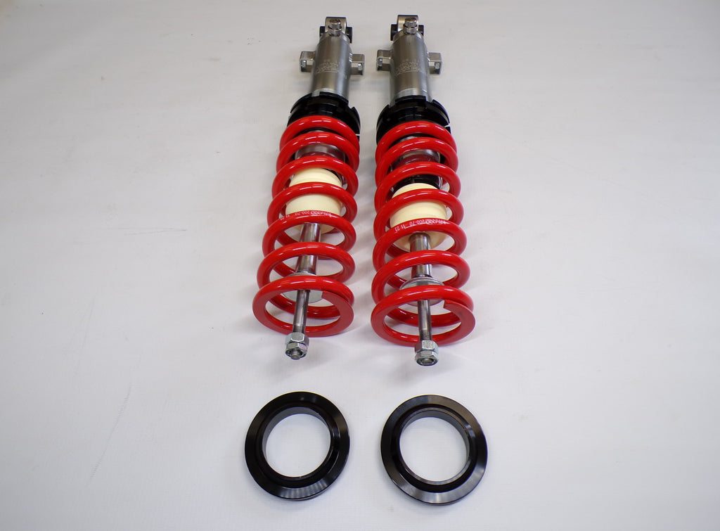 New aftermarket Flyin' Miata V-Maxx XXtreme Sport Coilover Kit for NB Mazda Miata. This coilover kit includes front and rear springs, four shocks, adjusting tools, and bumpstops. The shocks in the coilover kit have adjustable damping and an adjustable spring perch for full control over ride height and corner weighting. A 1/2" shorter rear shock body gives extra compression travel for improved ride and handling. The spring rates for XXtreme Sport coilovers are 391 lb/in in the front and 258 lb/in in the rear and are designed to be stiff enough for track and autocross use while being firm but useable on the street. The coilover kit does not include upper mounts as they are designed to work with the factory upper shock mounts. The Flyin' Miata V-Maxx XXtreme coilover kit comes with a two-year warranty. Fits 1999-2005.