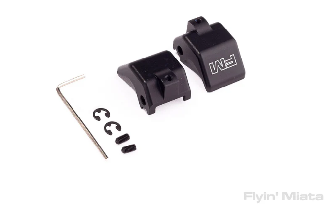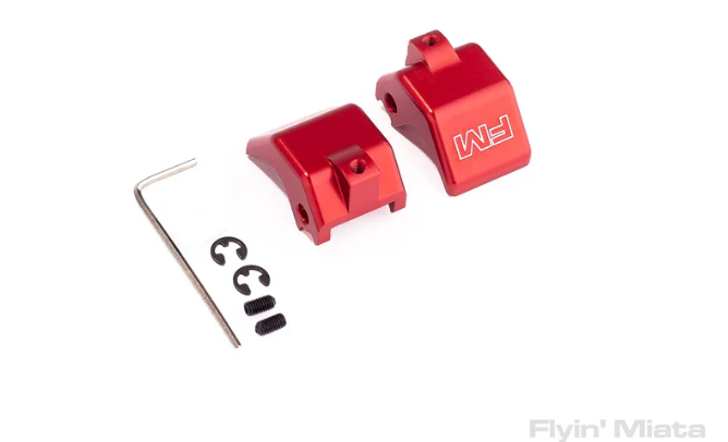 New Flyin' Miata convertible top and hard top latch repair locks for NA and NB Mazda Miata. These Flyin' Miata billet aluminum locks are used to repair worn convertible top or hard top latches that no longer stay latched in the closed position. These locks are engraved with the Flyin' Miata initials and are available in black or red. Fits 1990-2005. Sold as a pair of locks to repair two latches. Choose between black or red.