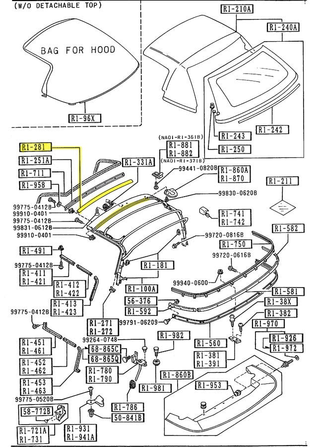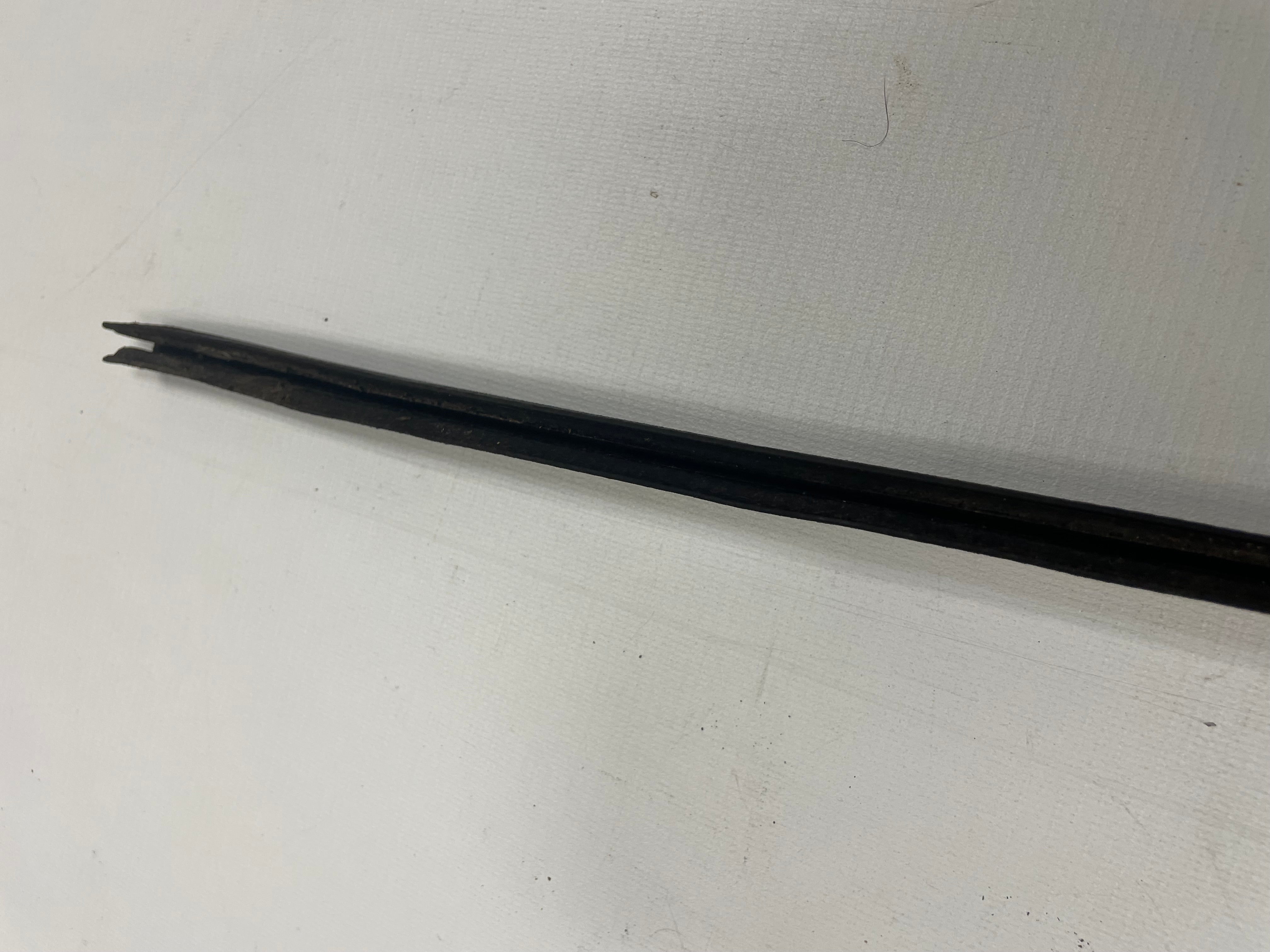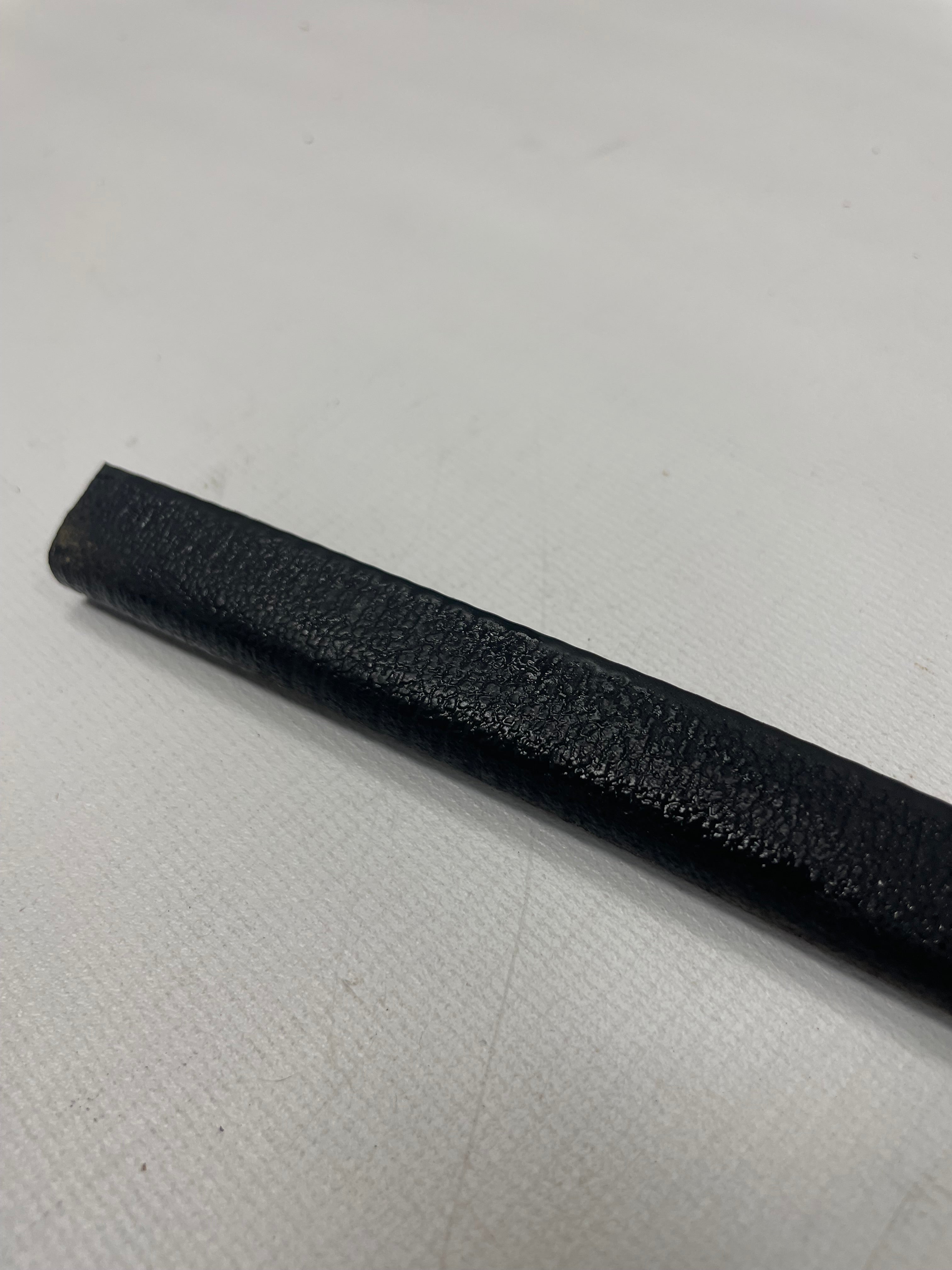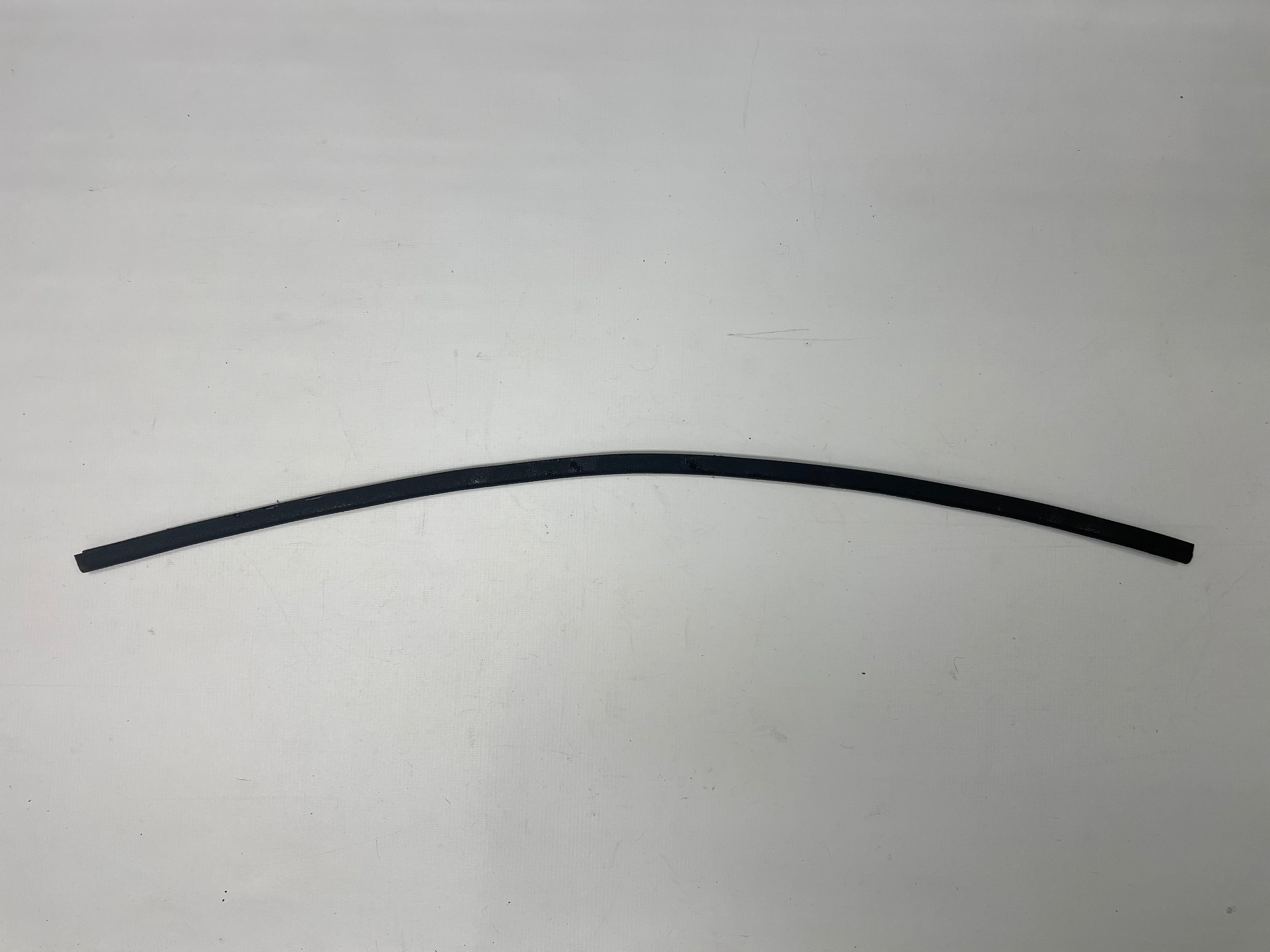 Used factory convertible top frame header bar rear molding for NA Mazda Miata. This is the black molding seal on the rear edge of the convertible top header bar. This molding has a channel that pushes onto the back edge of the header bar under the convertible top. Part number NA01-R1-281. Fits 1990-1997.