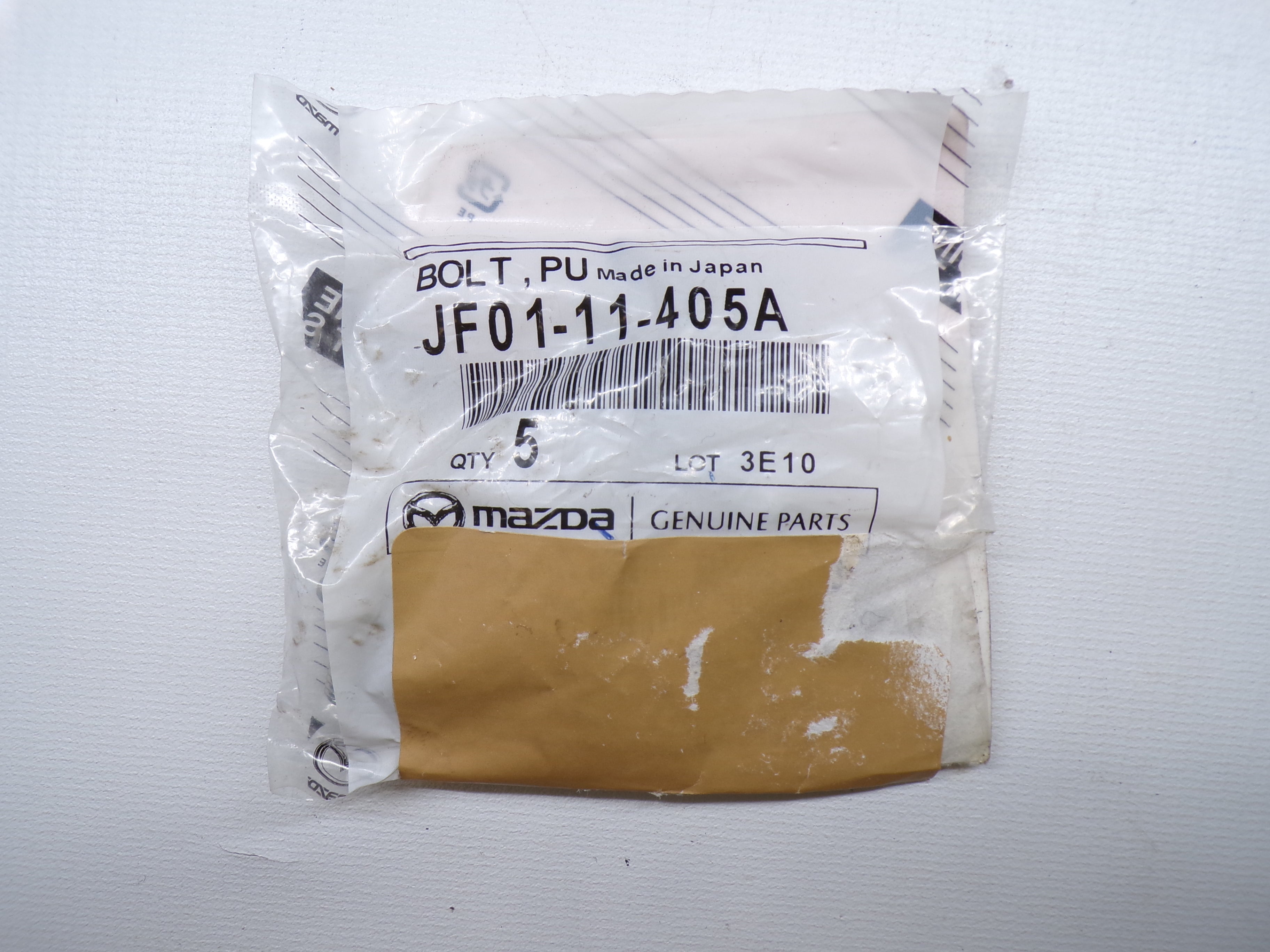 New factory Mazda OEM crank shaft pulley bolt for NA Mazda Miata. This is one of the four bolts that attach the crank shaft pulley and harmonic balancer to the timing gear on the front of the crankshaft. Part number JF01-11-405A. Fits 1991-1997.