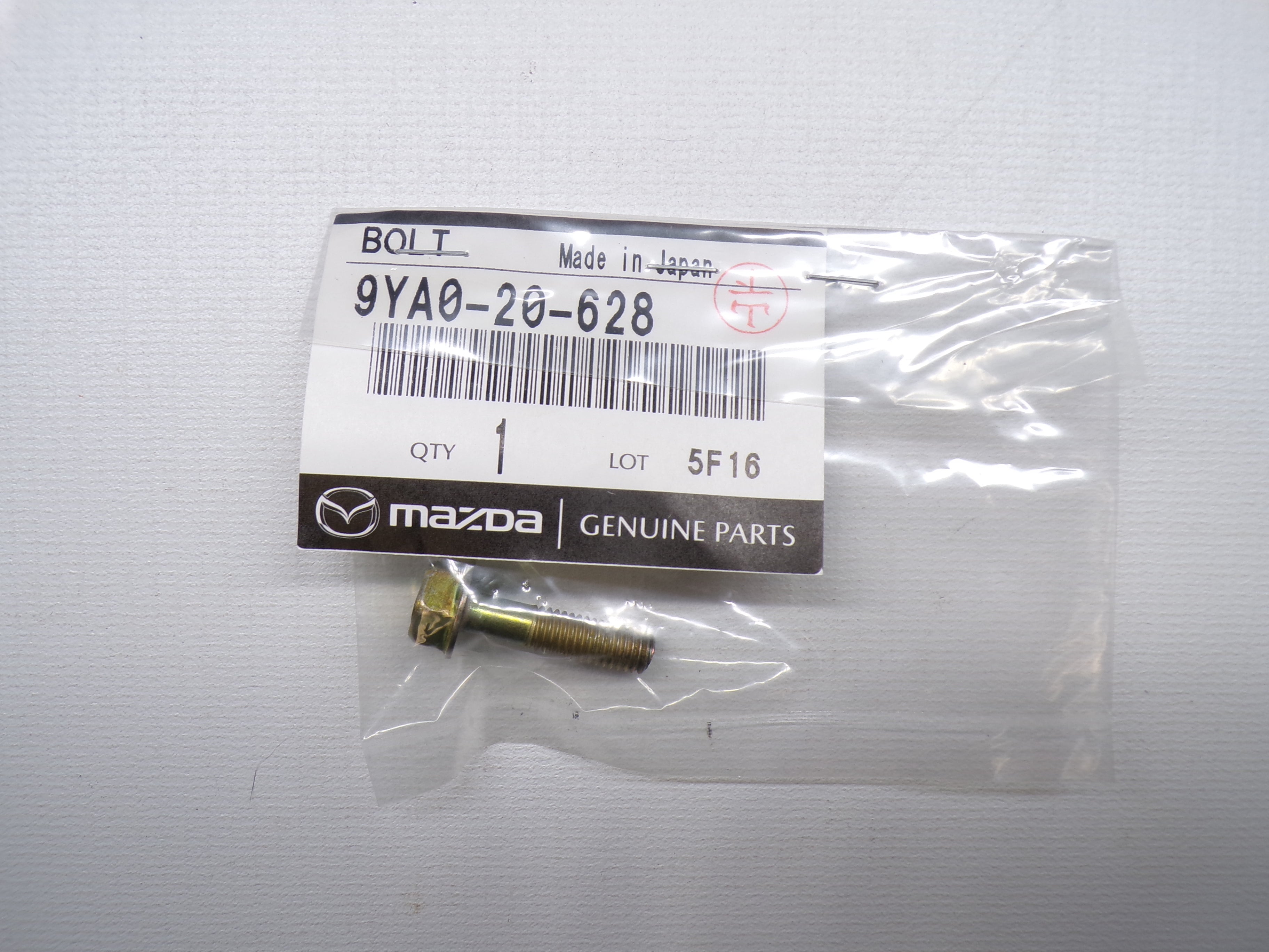New factory Mazda OEM crank shaft pulley bolt for 1.8 liter engine for NB Mazda Miata. This is one of the four bolts that attach the crank shaft pulley and harmonic balancer to the timing gear on the front of the crankshaft. Part number 9YA0-20-628. Fits 1999-2005.