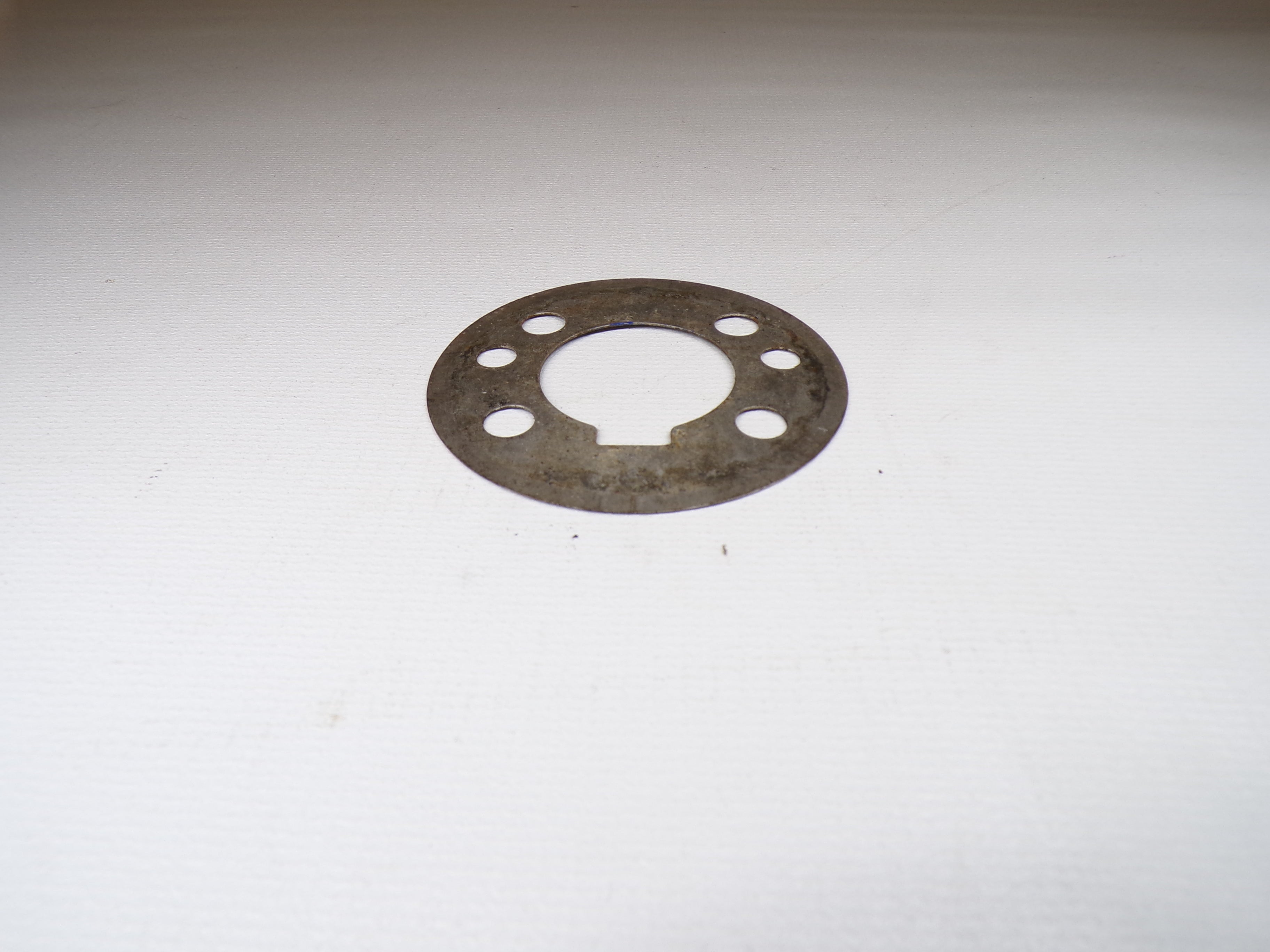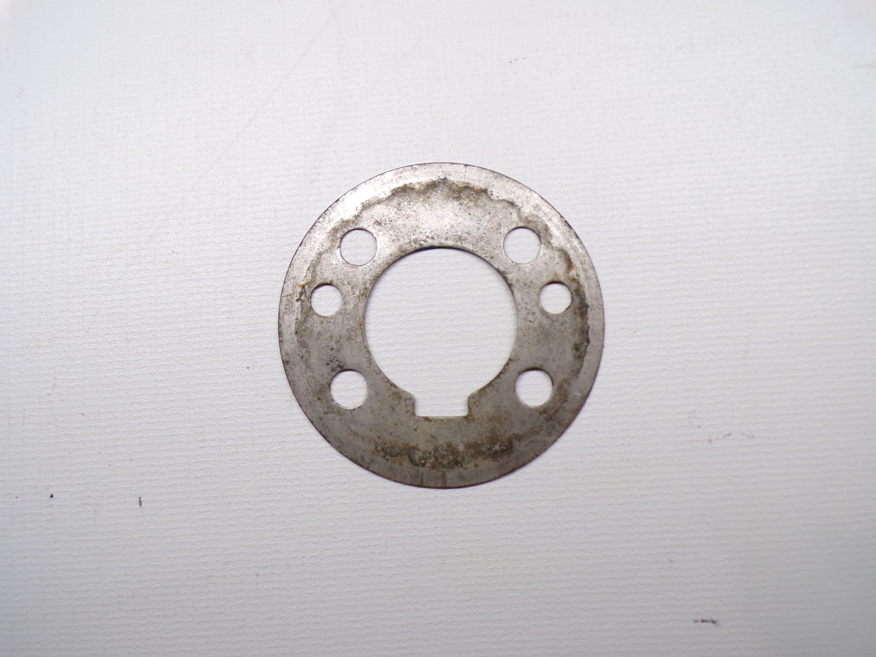 Used factory crankshaft timing gear outer guide plate for Early NA Mazda Miata. This the round thin plate that mounts just behind the crank shaft pulley and in front of the timing gear guide plate flange. Part number B631-11-414. Fits 1990-1991.