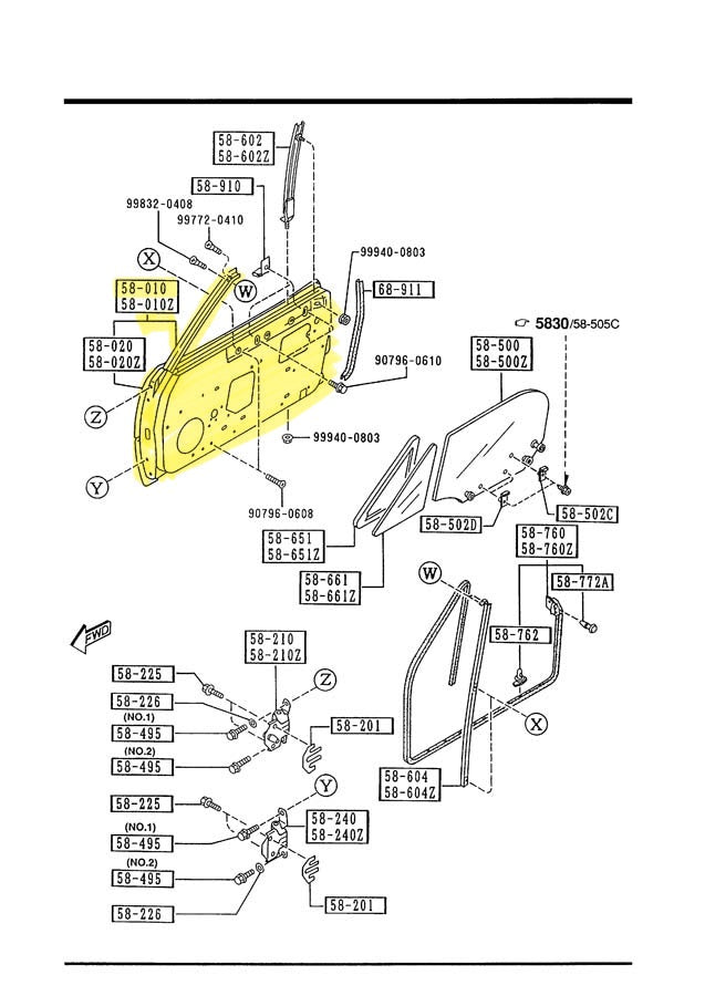 New Factory Mazda OEM passenger side door shell for NA Mazda Miata. This is the empty metal shell for the door and the front edge of frame for the triangle window. This style of door shell has the larger hole for an electric exterior side view mirror. Triangle window, window guides, exterior mirror, door panel, door weather stripping, door hinges, interior and exterior door handles, window glass, wiring, and window regulator not included. Part number NAY4-58-02XB. Fits 1990-1997. Choose year.