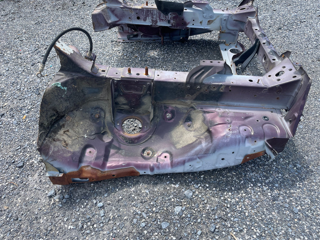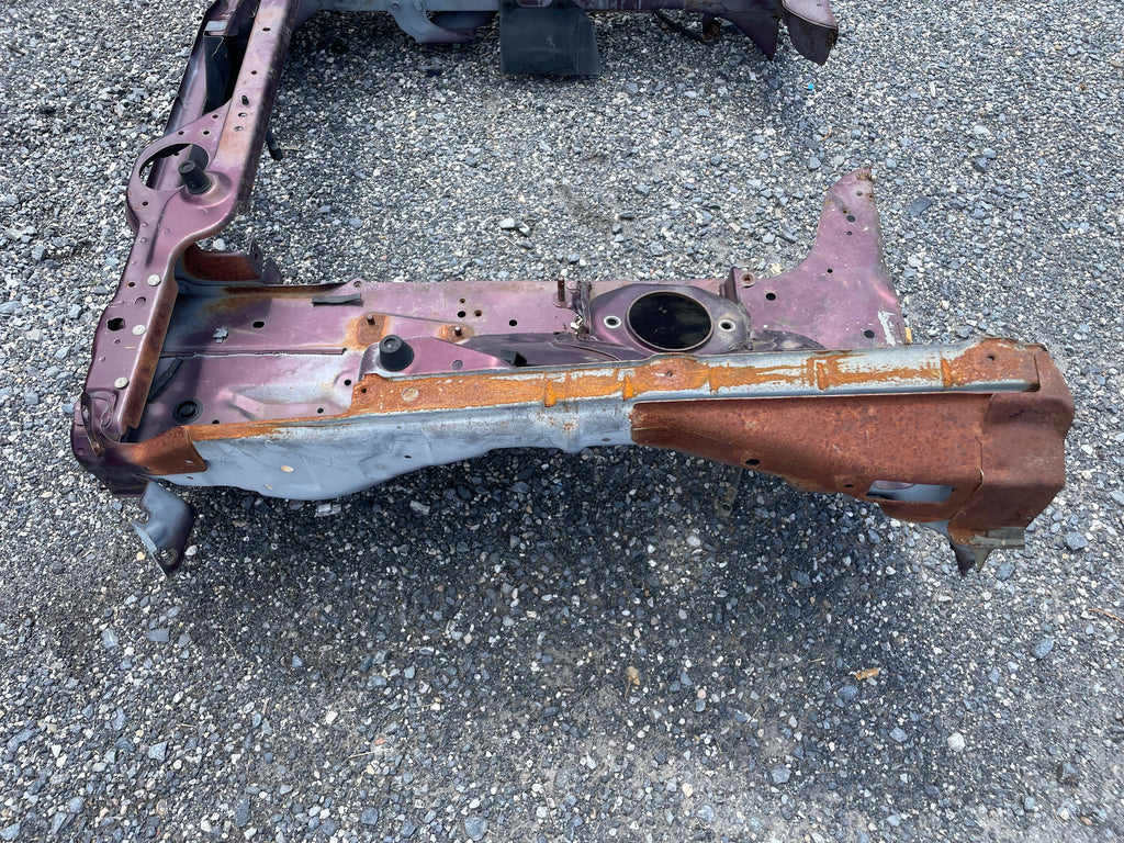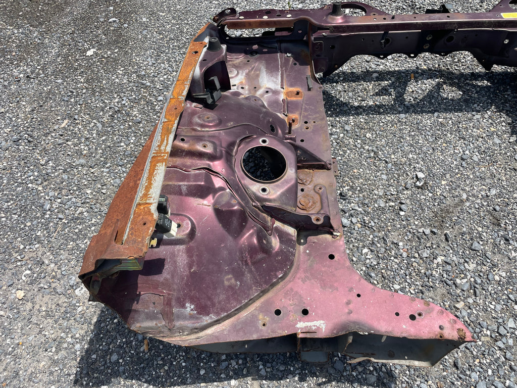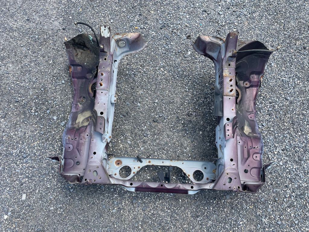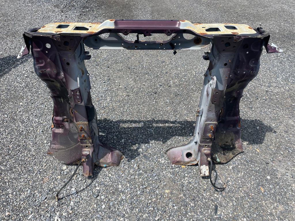 Used factory front frame rail clip cut out for NA Mazda Miata. This is the driver and passenger side frame rail, shock towers, as well as the radiator support connecting the two. The 90-93 style has different mounting pieces for the air conditioning condenser than the 94-97 has. The front bumper mounting brackets, front bumper, and headlight frames are not included. This item will be cut out of a donor vehicle. Fits 1990-1997. Choose between 90-93 or 94-97.