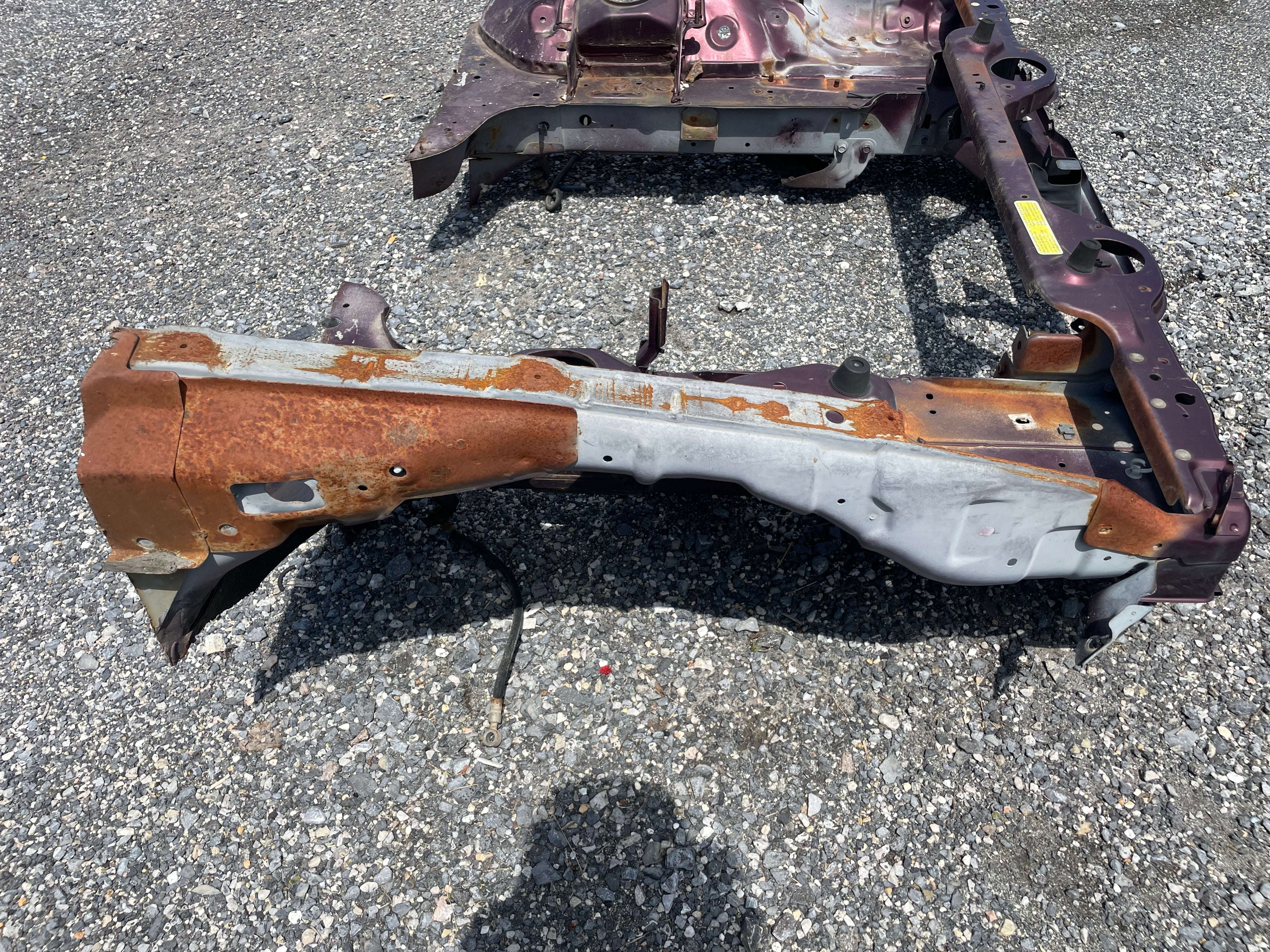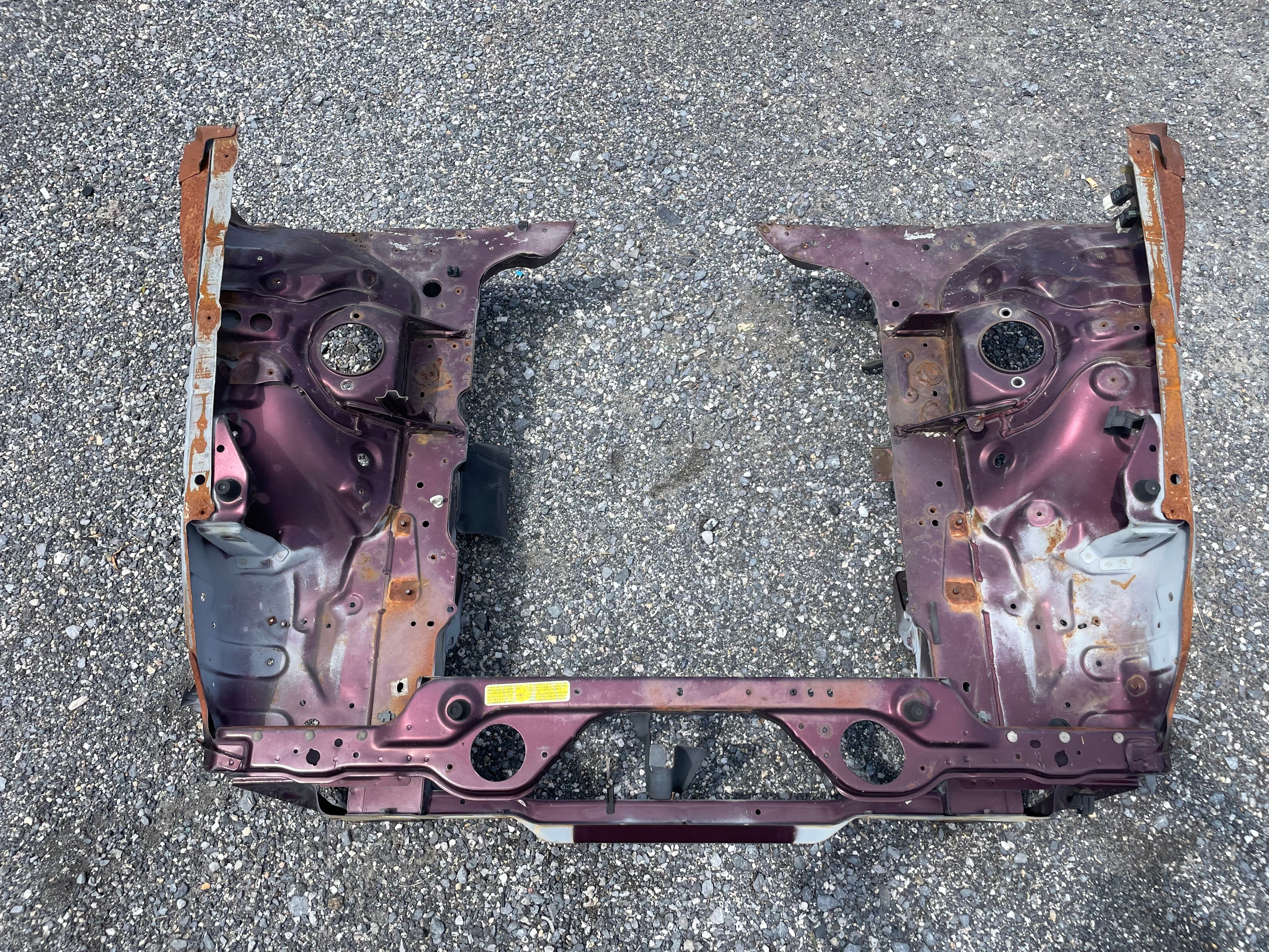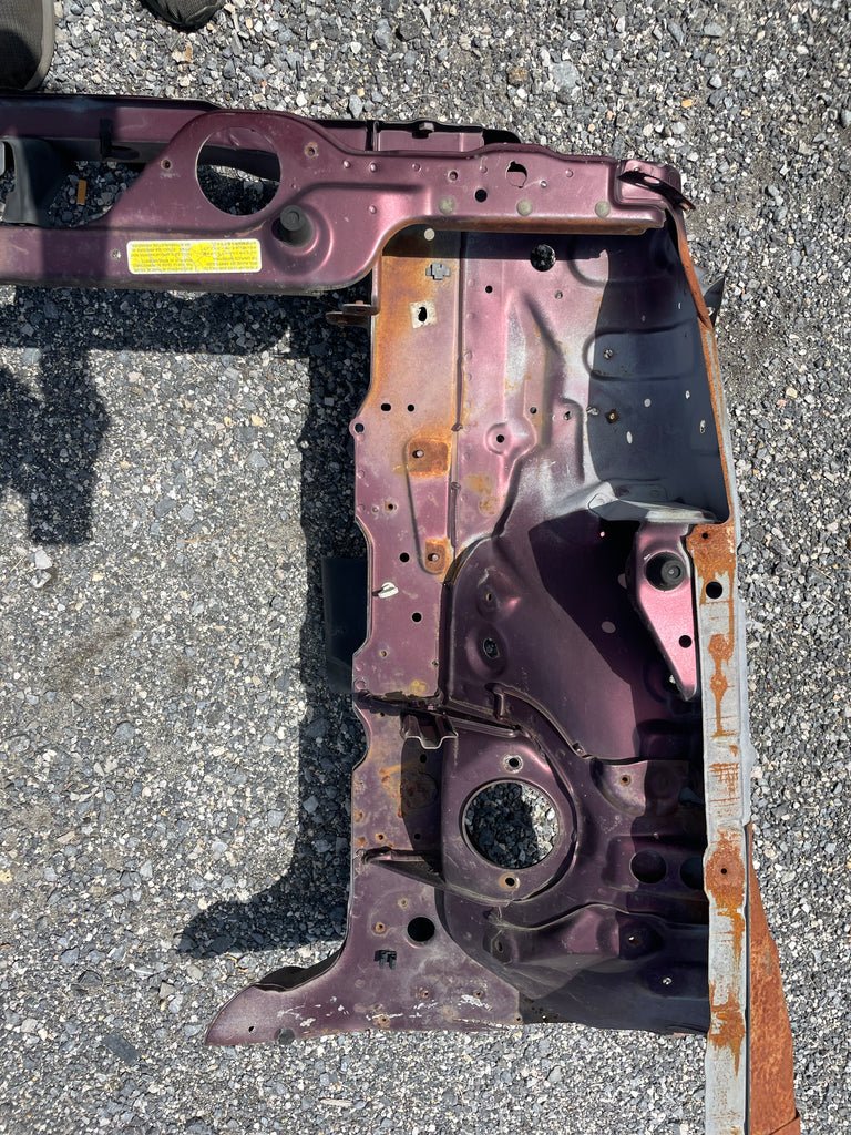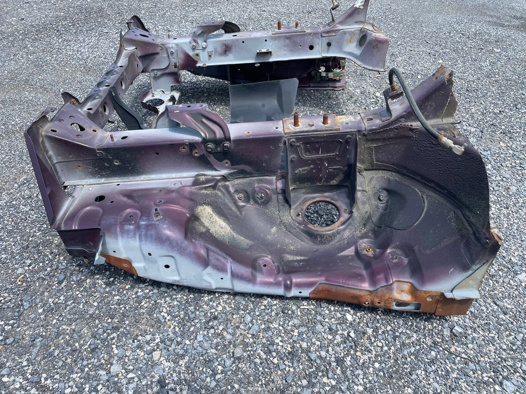 Used factory front frame rail clip cut out for NA Mazda Miata. This is the driver and passenger side frame rail, shock towers, as well as the radiator support connecting the two. The 90-93 style has different mounting pieces for the air conditioning condenser than the 94-97 has. The front bumper mounting brackets, front bumper, and headlight frames are not included. This item will be cut out of a donor vehicle. Fits 1990-1997. Choose between 90-93 or 94-97.