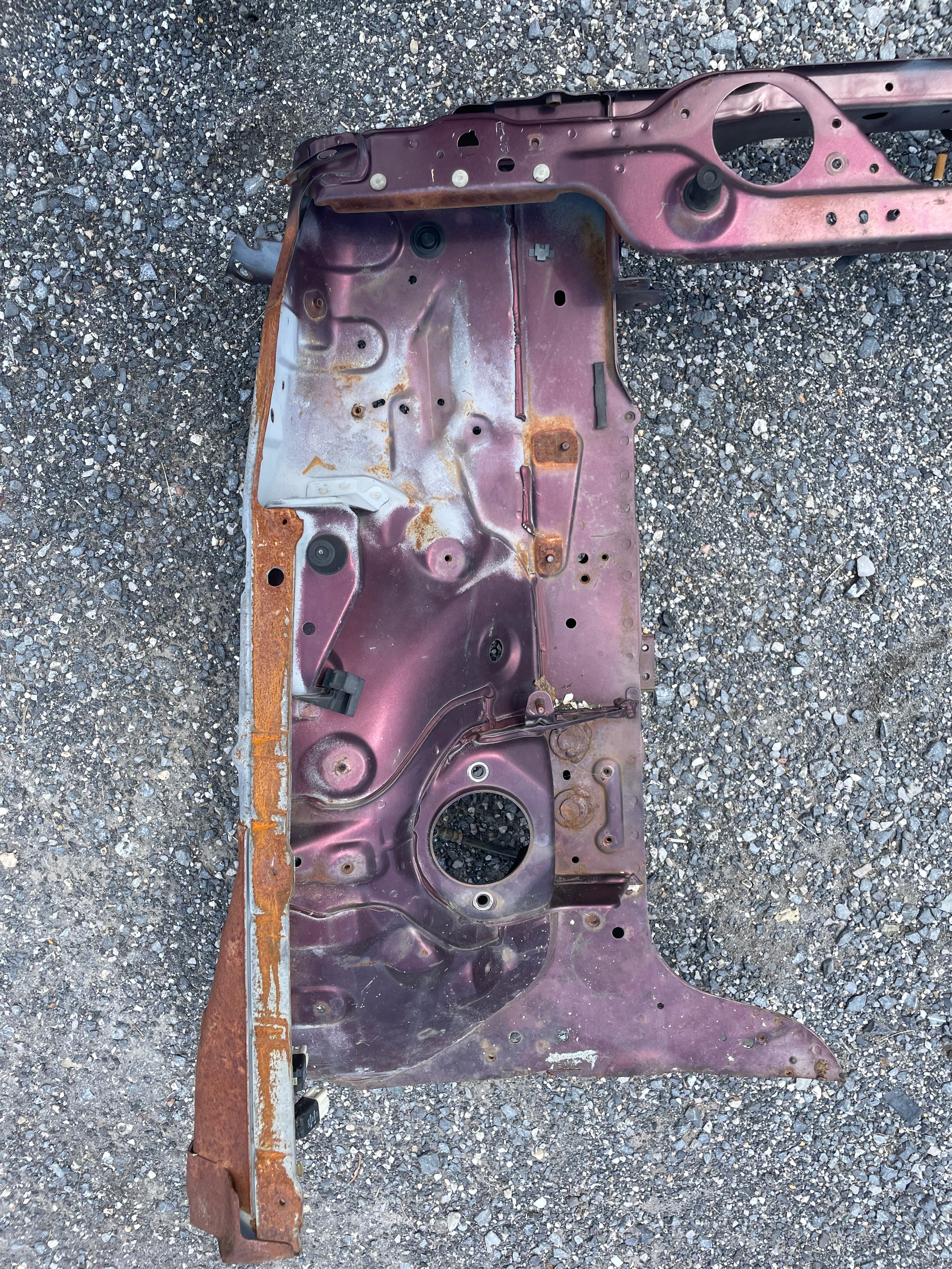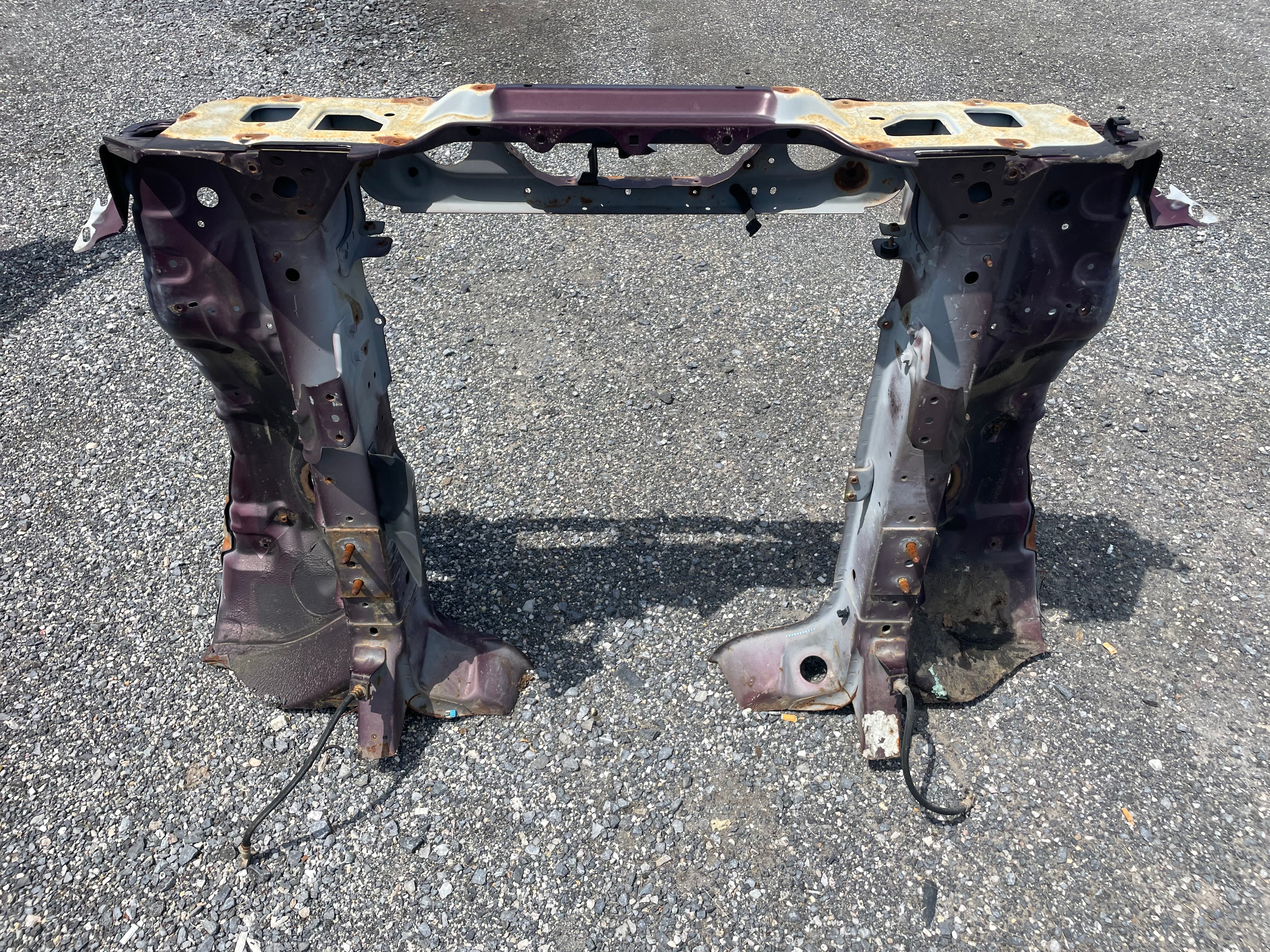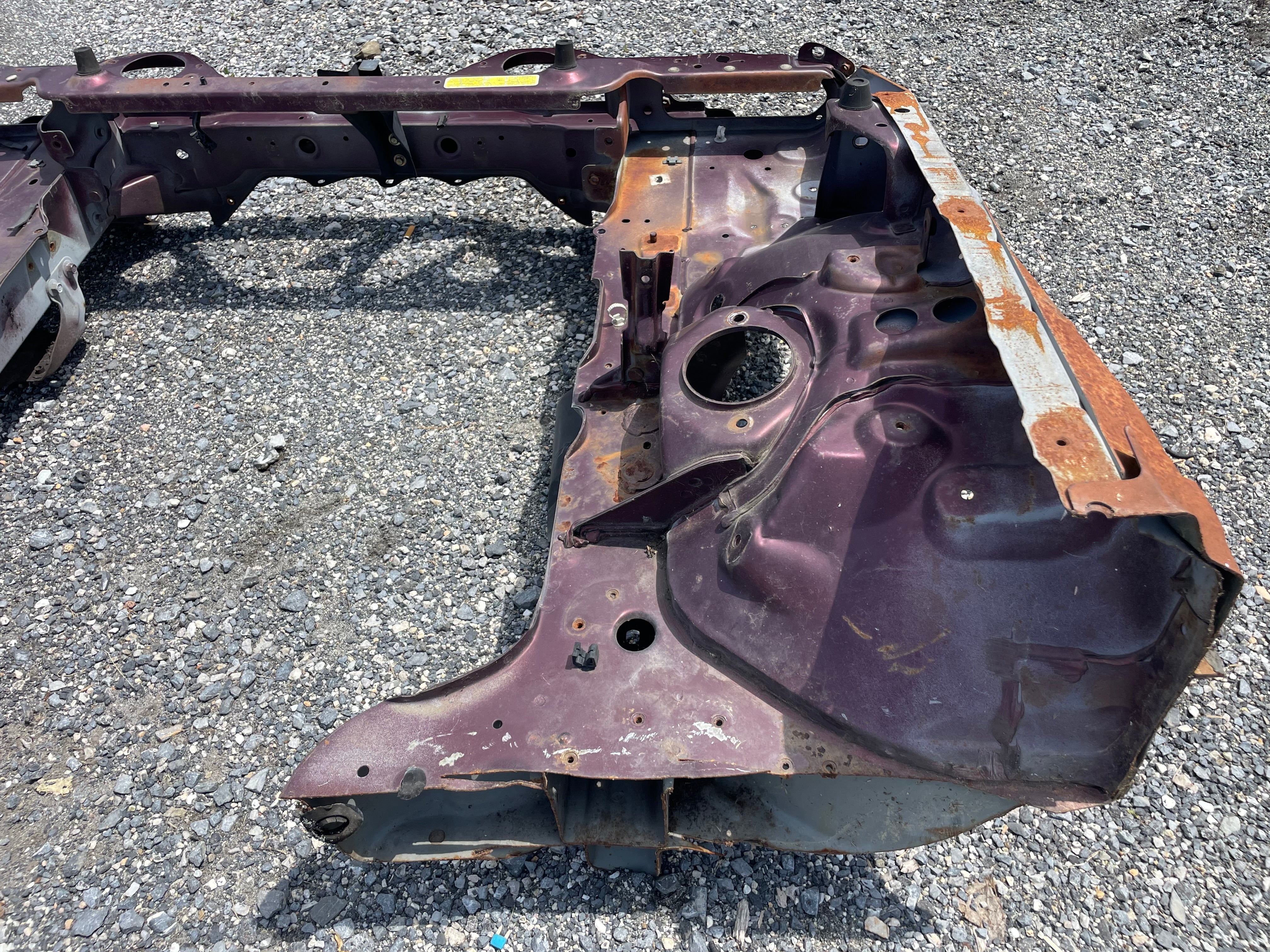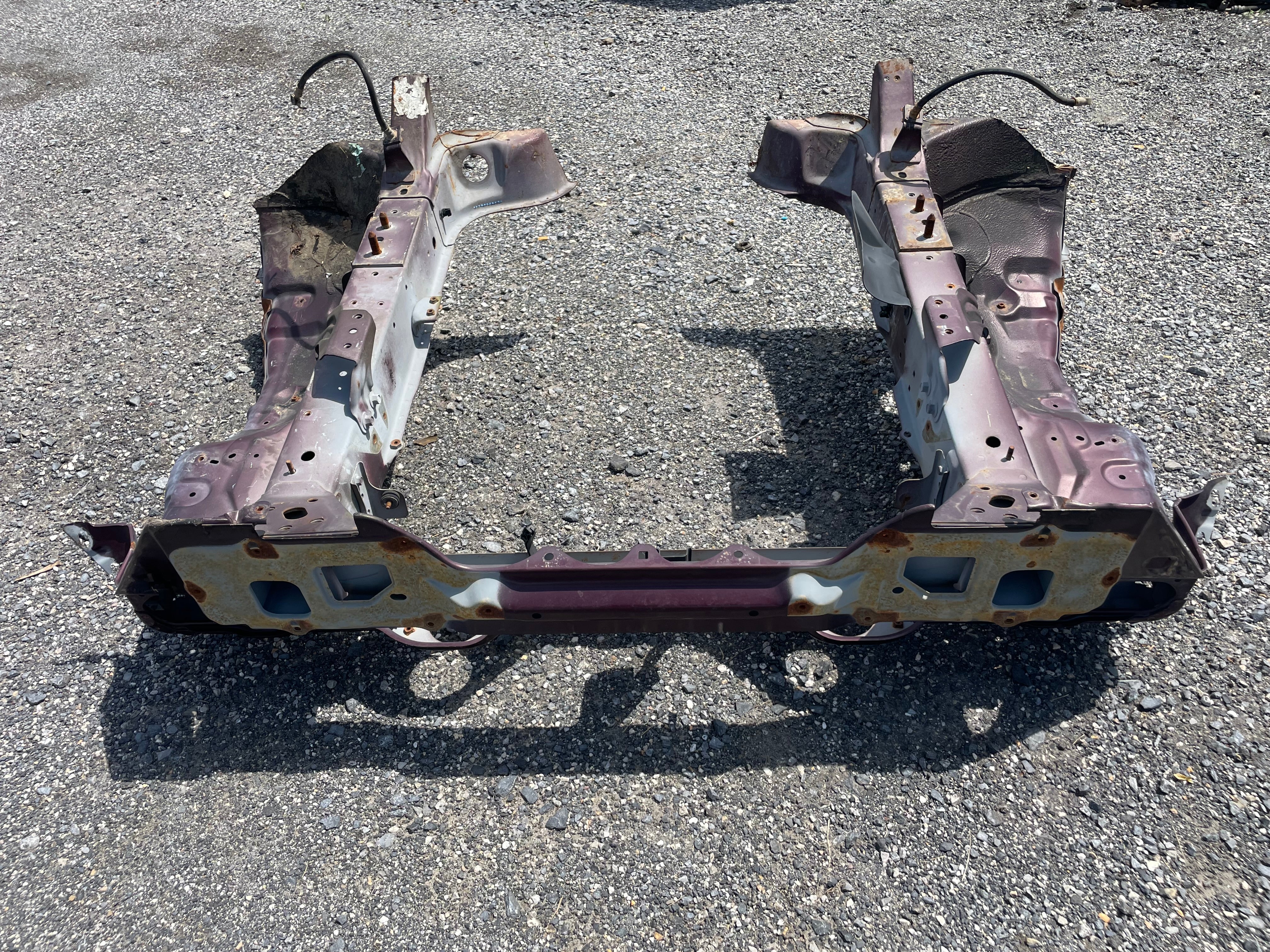 Used factory front frame rail clip cut out for NA Mazda Miata. This is the driver and passenger side frame rail, shock towers, as well as the radiator support connecting the two. The 90-93 style has different mounting pieces for the air conditioning condenser than the 94-97 has. The front bumper mounting brackets, front bumper, and headlight frames are not included. This item will be cut out of a donor vehicle. Fits 1990-1997. Choose between 90-93 or 94-97.