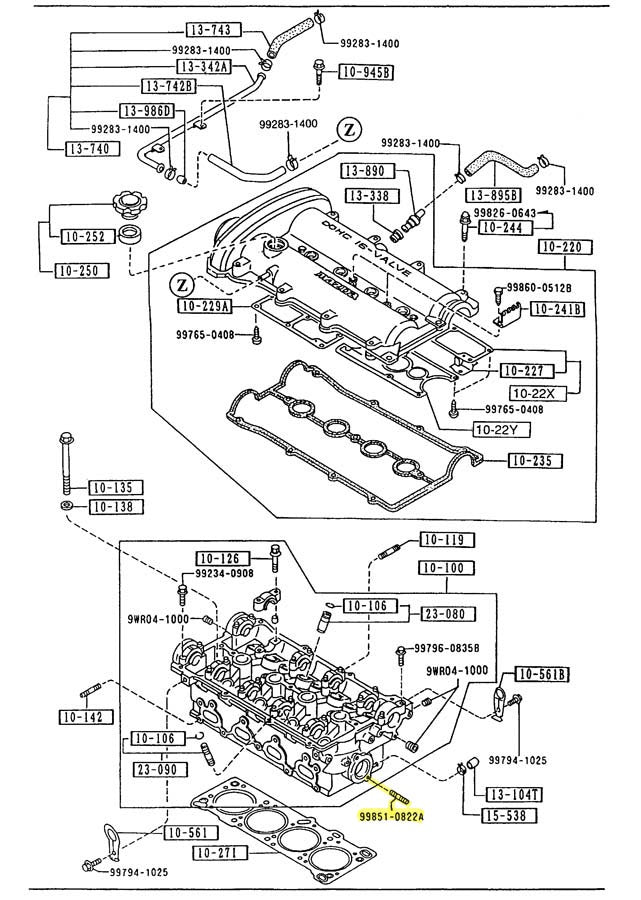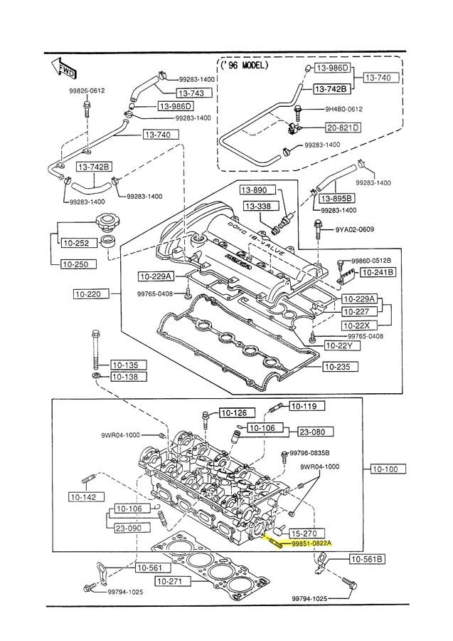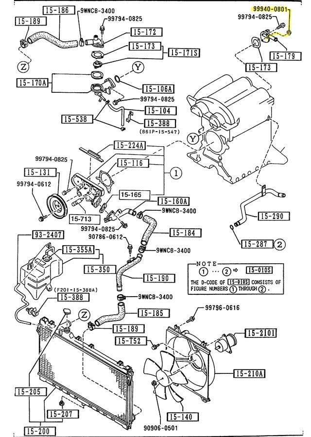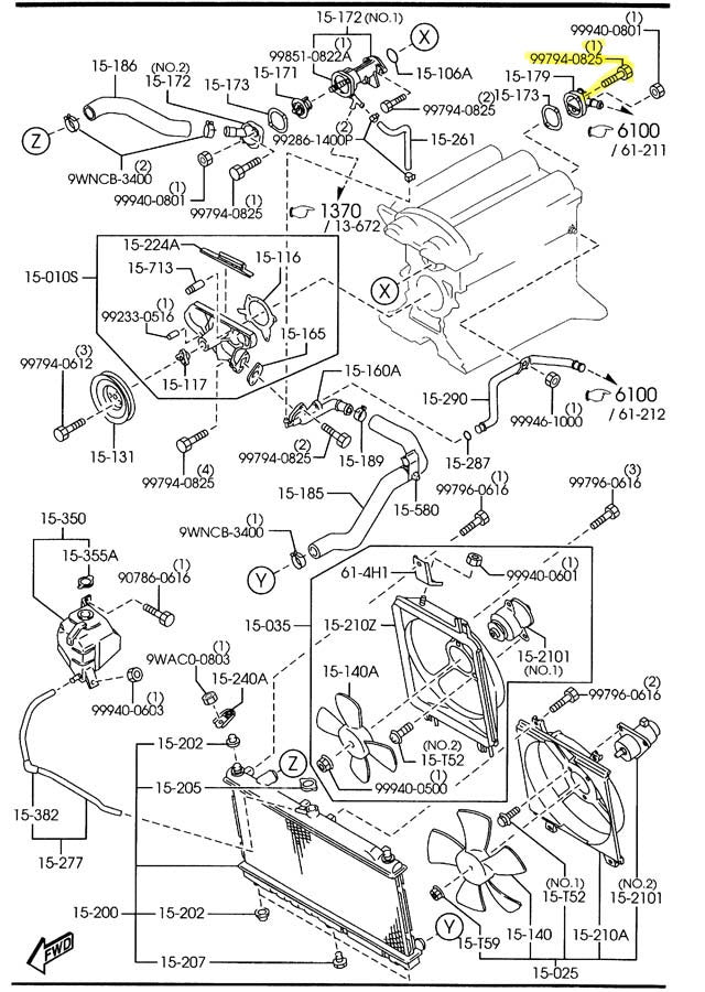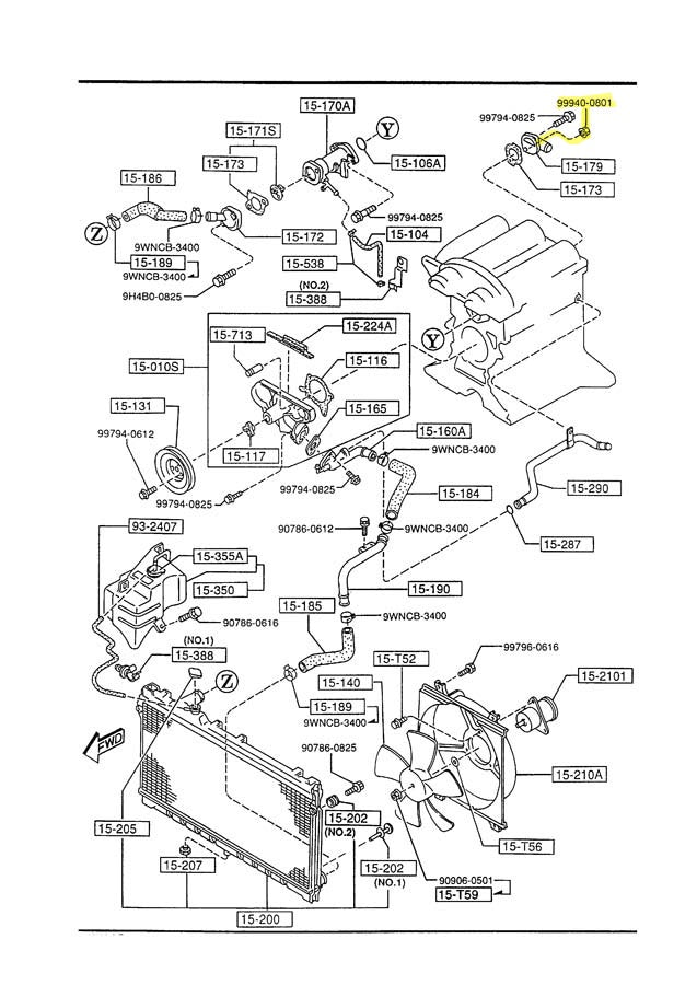 New factory Mazda OEM engine coolant water rear outlet housing hardware for NA and NB Mazda Miata. This is either the bolt, nut, or threaded stud that is used to attach the aluminum coolant housing to the rear of the cylinder head. The engine coolant flows through the cylinder head and into it. Hardware only. Aluminum housing, coolant sensor, and gasket not included. Part numbers 9979-40-825 (bolt) or 9994-00-801 (nut), or 9985-10-822A (stud). Fits 1990-1993. Choose the type of hardware.