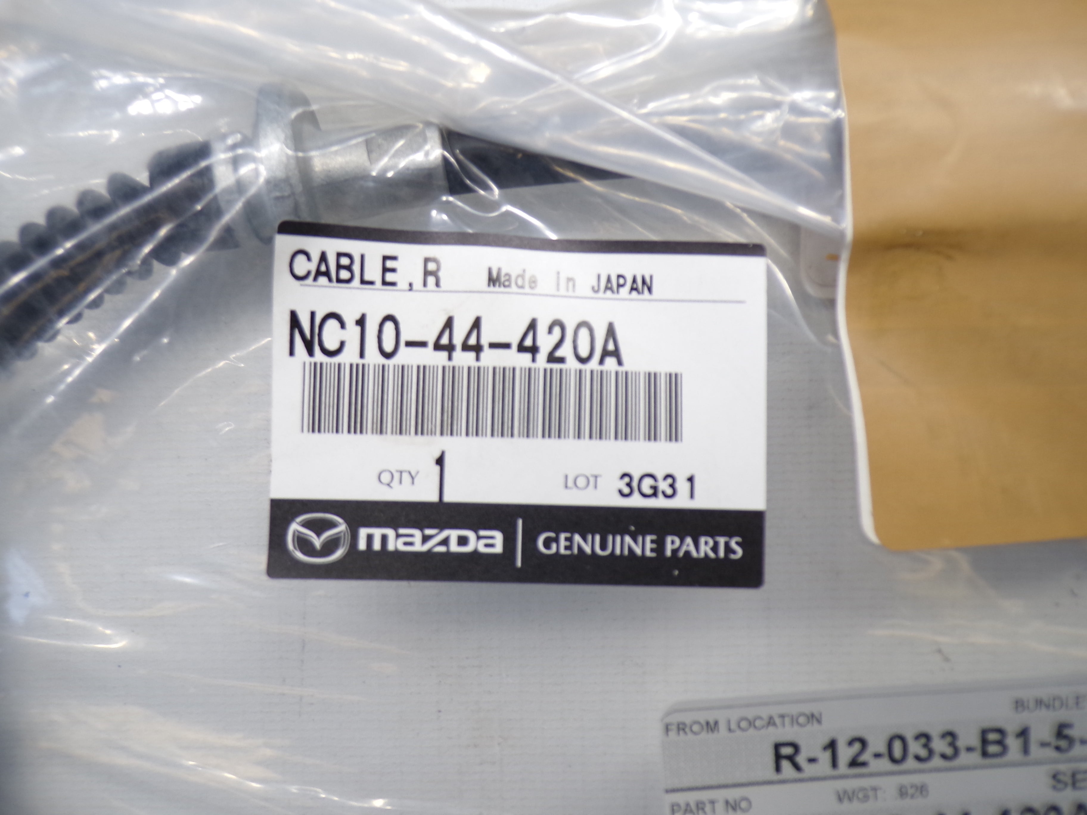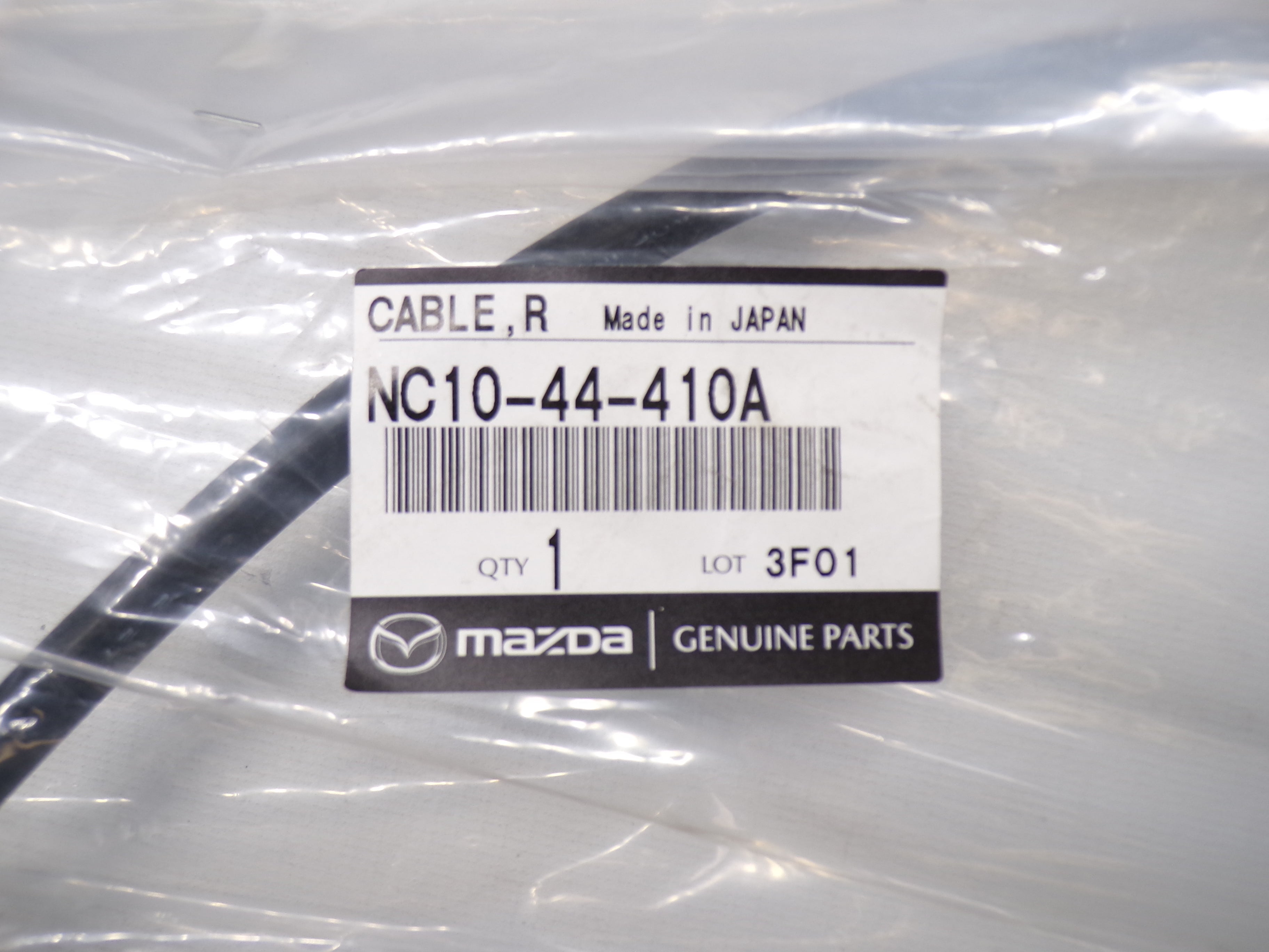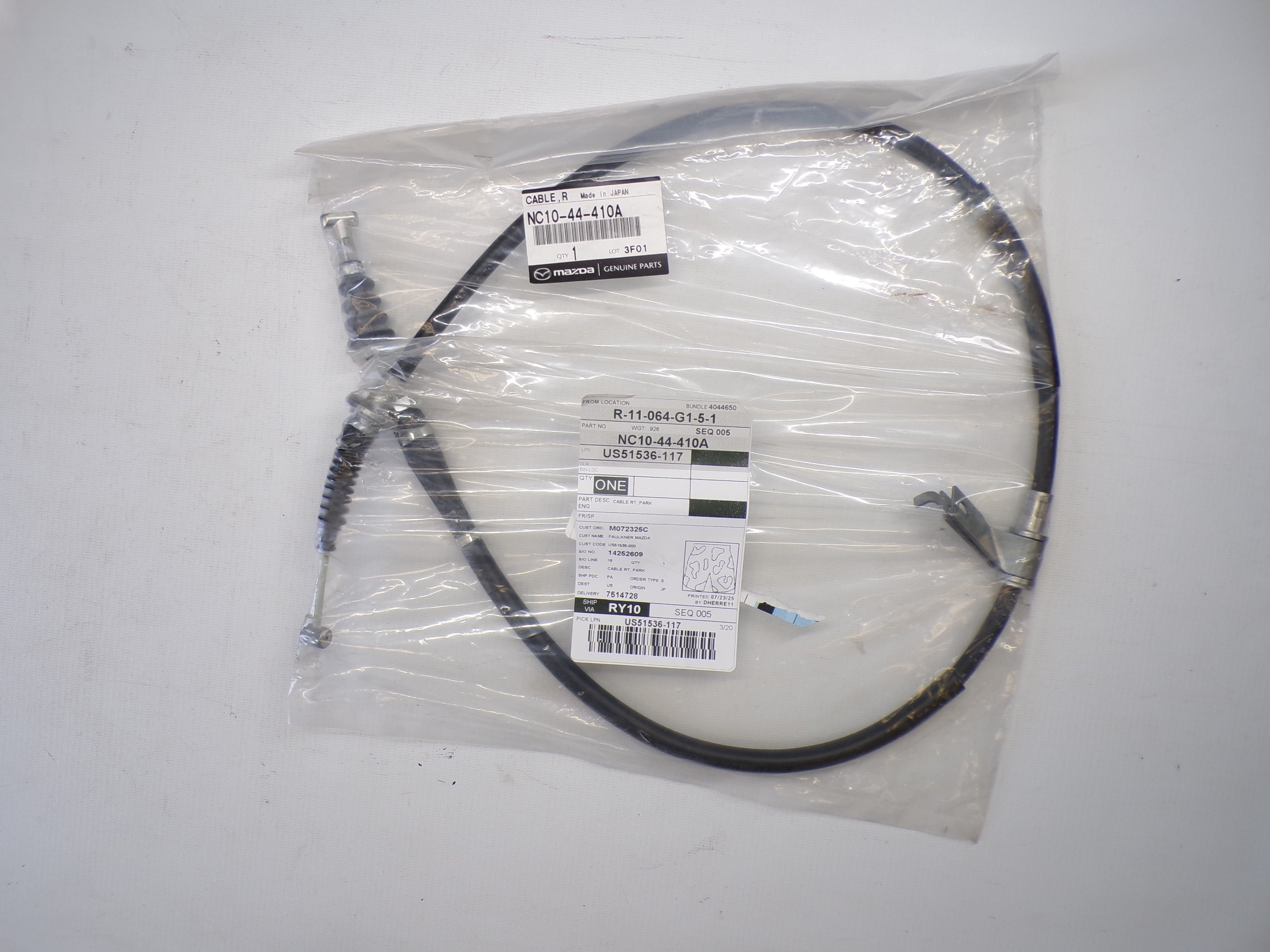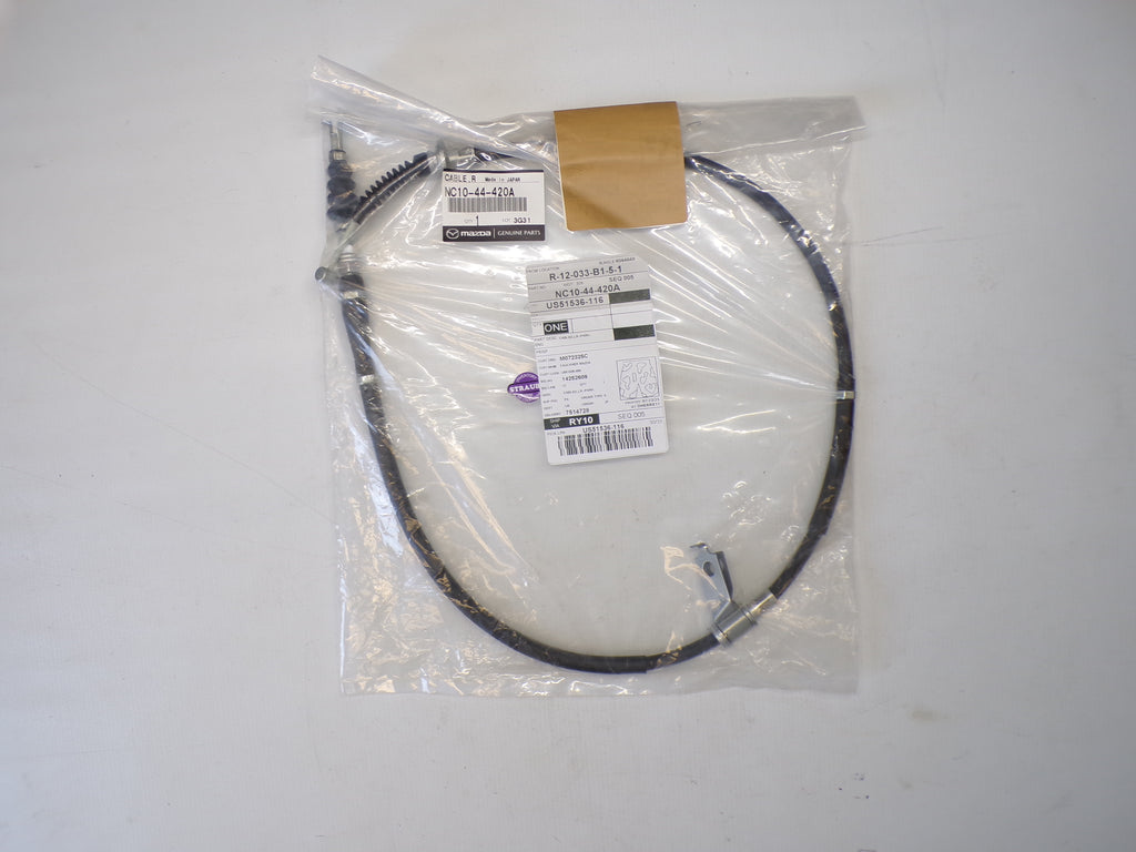 New factory Mazda OEM emergency brake cable for NB Mazda Miata. This is one of the three brake cables that connect the emergency brake handle to the rear brake calipers on the driver and passenger sides. Also known as the parking brake cables. Emergency brake handle and hardware not included. Fits 1999-2005. Sold individually as one brake cable. Choose between the front short emergency brake cable for the emergency brake handle (NA01-44-150D), driver side rear emergency brake cable (NC10-44-420A), or passenger side rear emergency brake cable (NC10-44-410A).