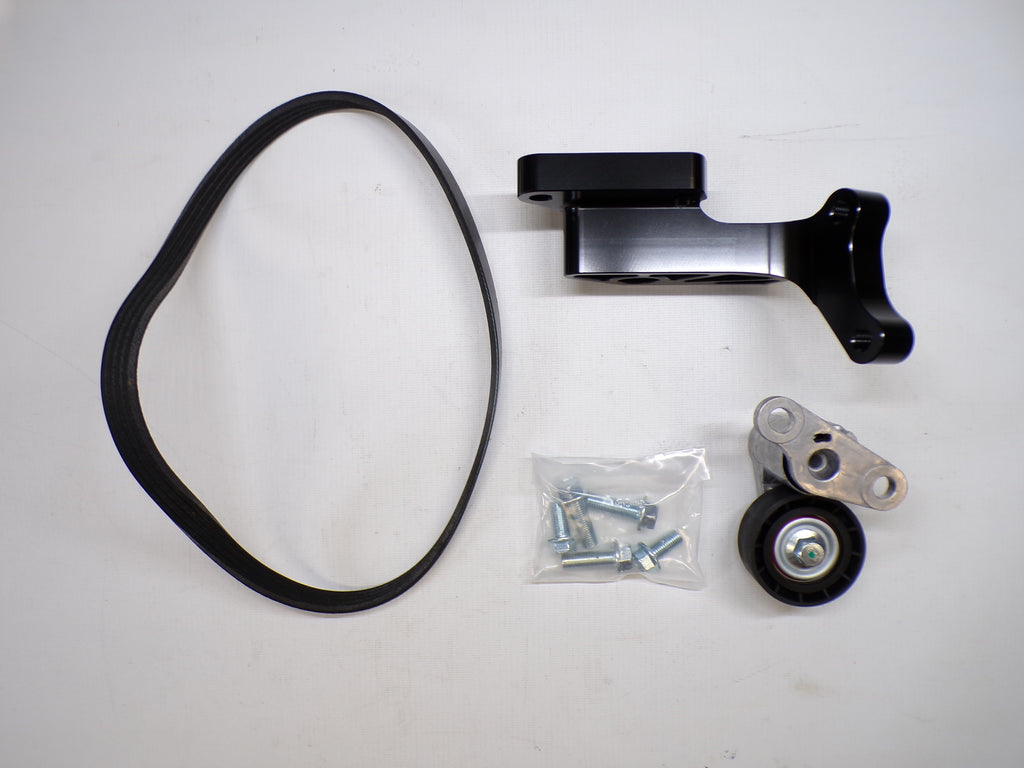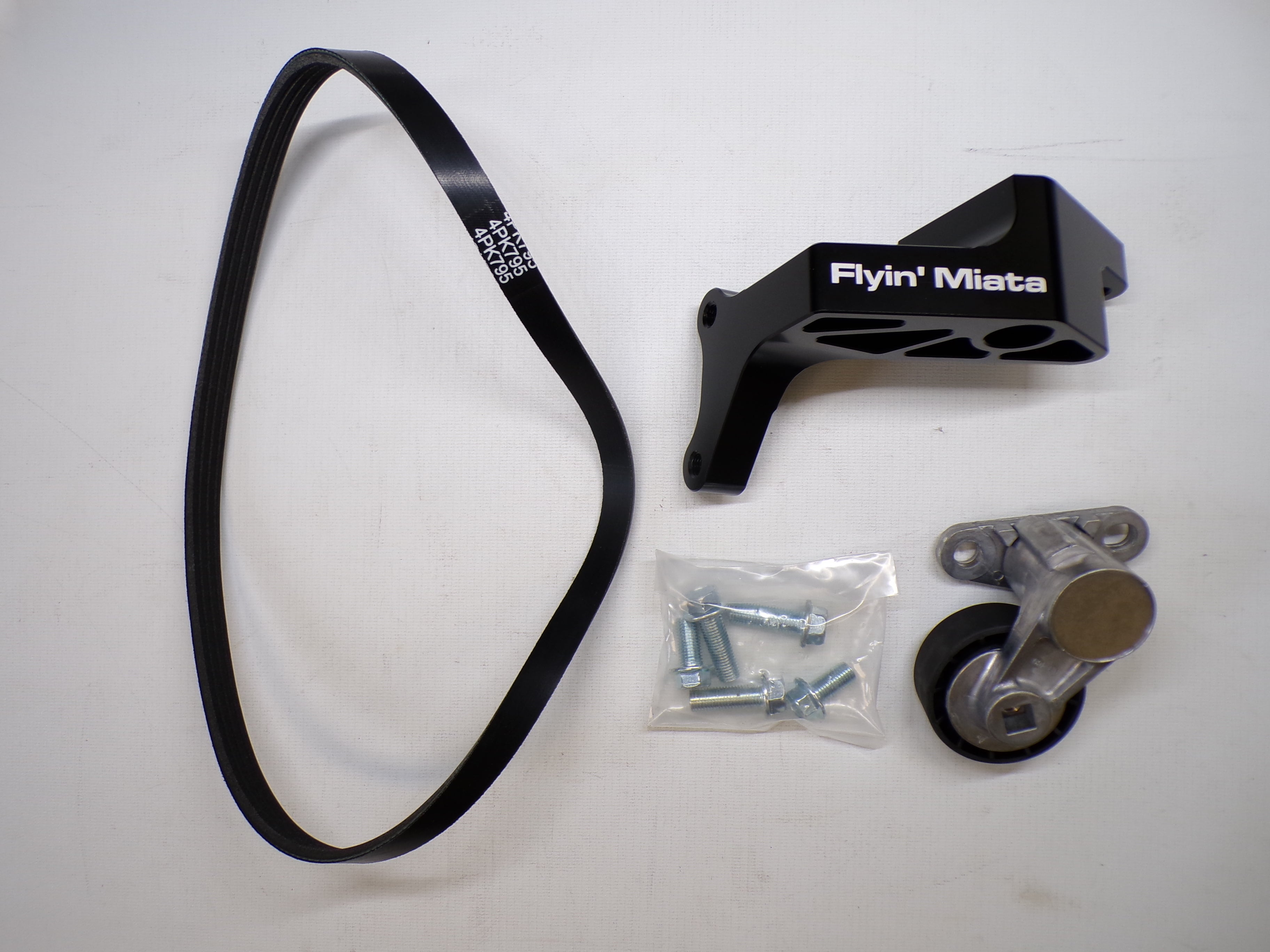 New Flyin' Miata power steering pump delete kit for NA and NB Mazda Miata. This kit allows you to remove your power steering pump while keeping the air conditioning compressor intact and working. The Flyin' Miata power steering delete kit includes a black anodized aluminum bracket, an automatic belt tensioner, the correct sized serpentine belt, and all attachment hardware. Fits 1990-2003. The included serpentine belt does not fit 2004-2005 due to the smaller size of the pulley on the air conditioning compressor. The serpentine belt to fit 2004-2005 is available separately (part number 04-16035).