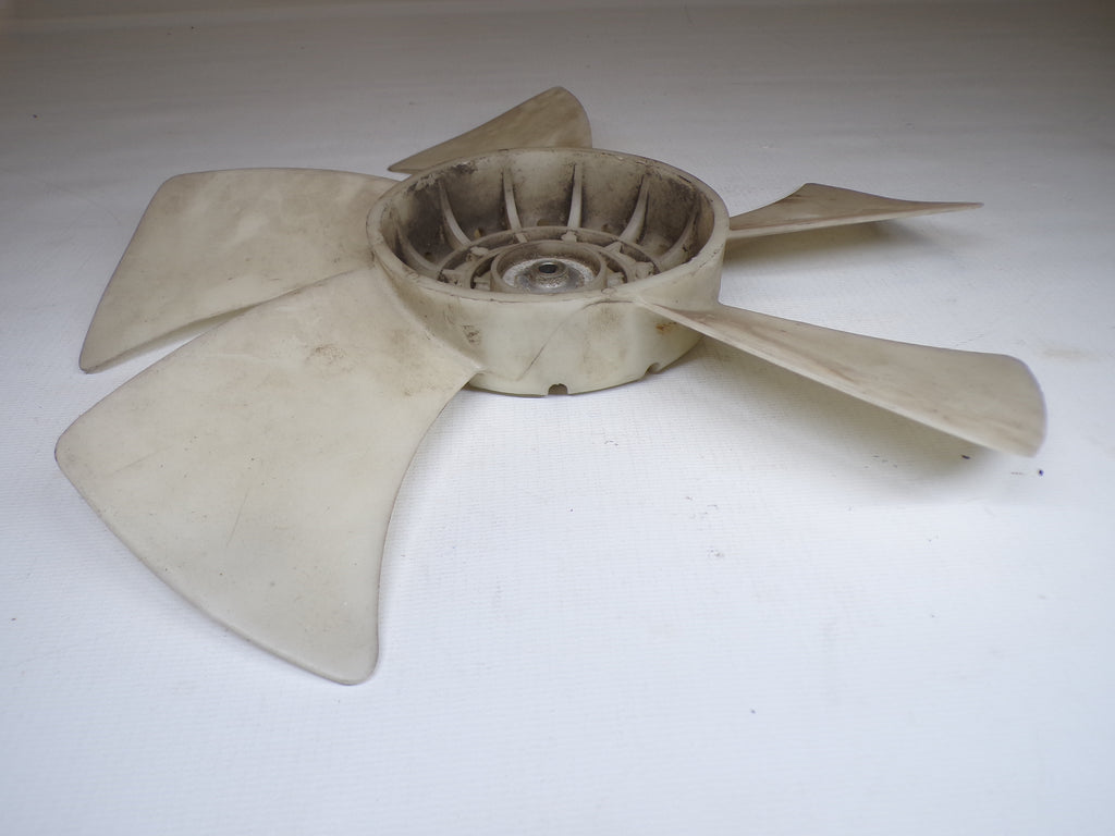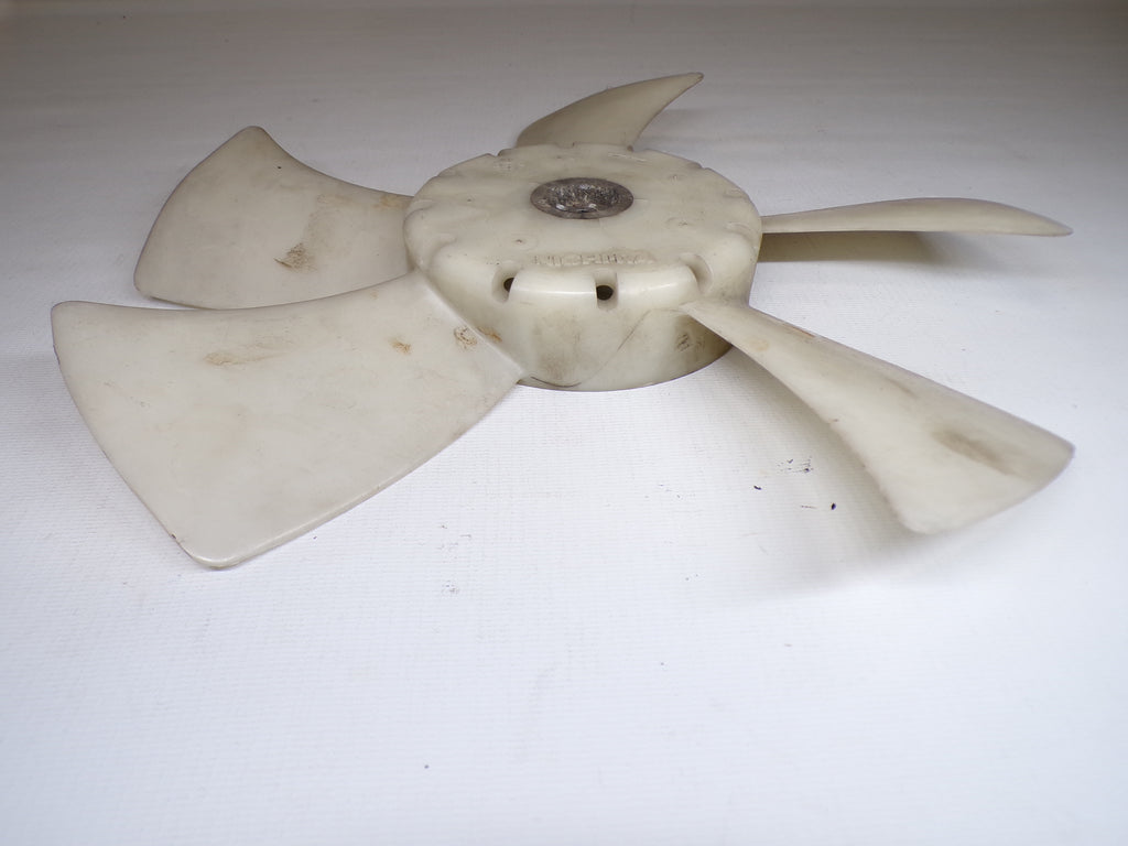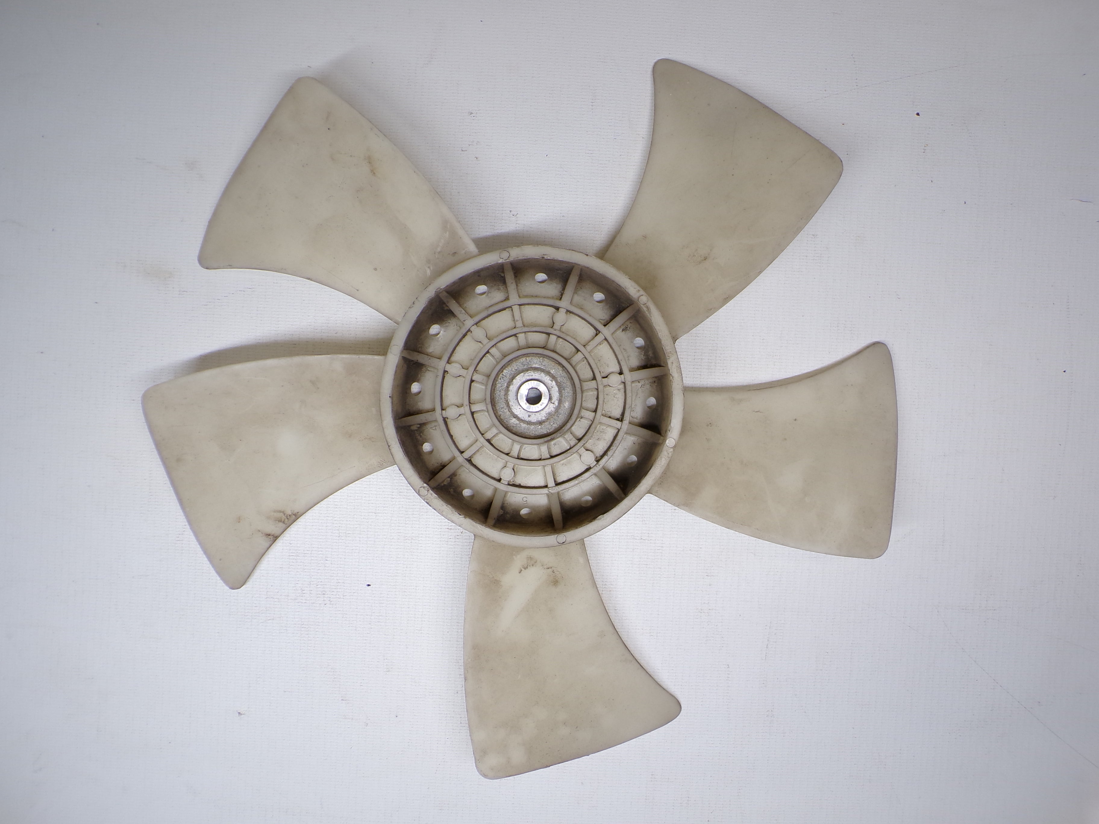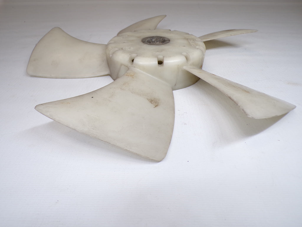 Used factory main radiator cooling fan blades for Early NA Mazda Miata. This is the main cooling fan white plastic blades that are attached to the driver side of the radiator. The plastic fan has five blades and attaches to the front of the fan motor with a nut. The fan activates when the temperature of the coolant reaches a certain level. Fan blades only. Motor, shroud, and hardware are not included. Fits 1990-1993.