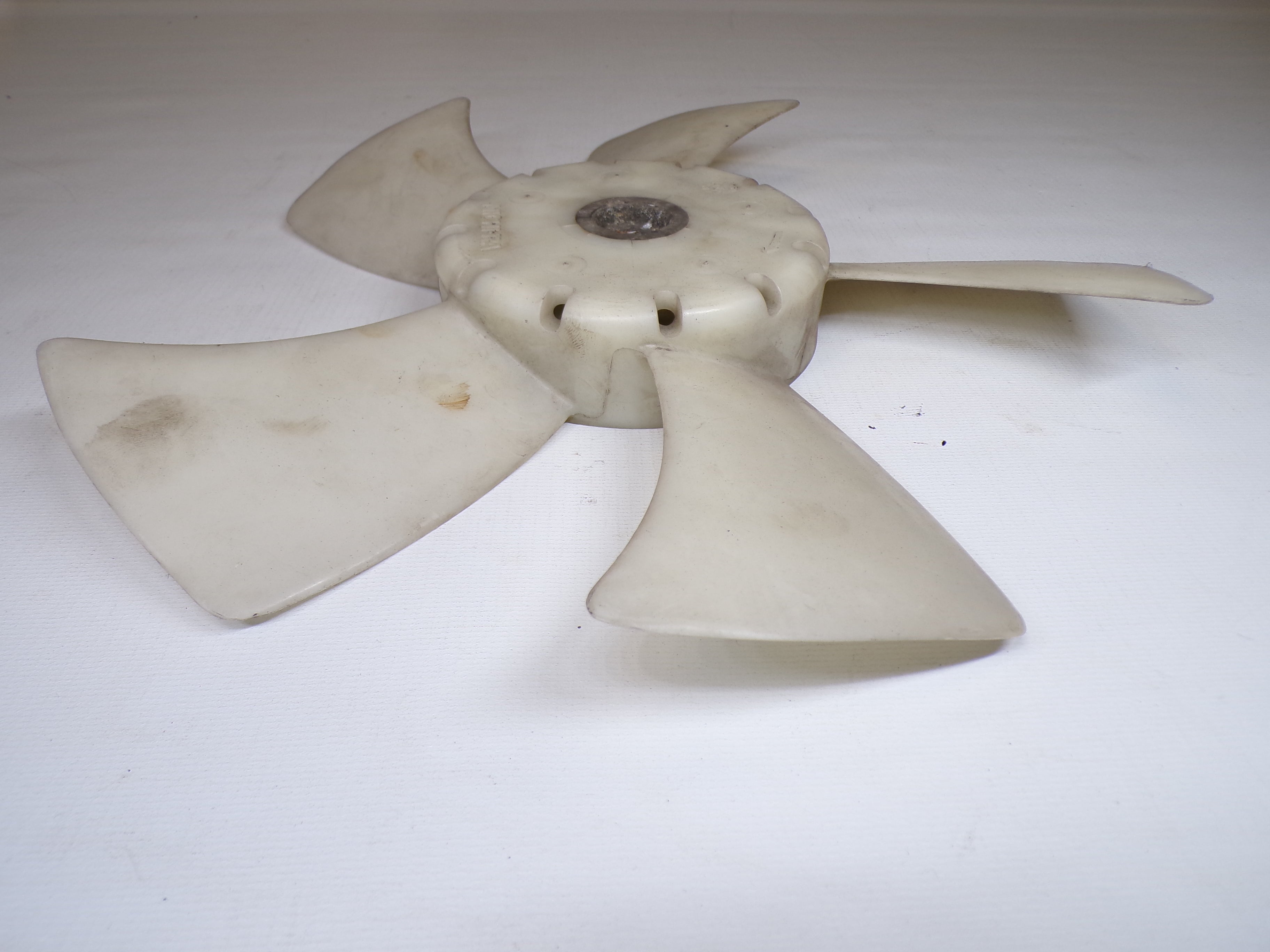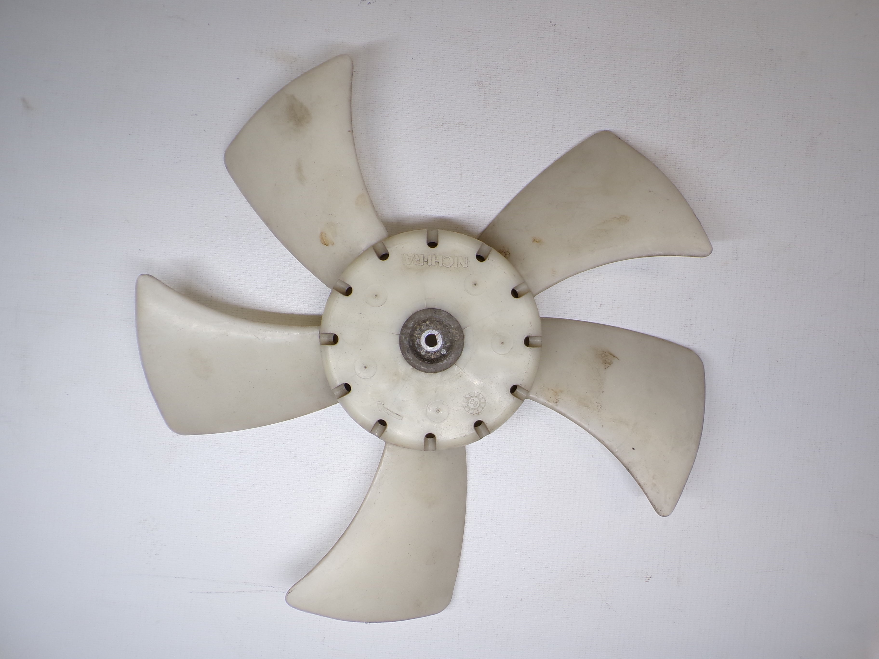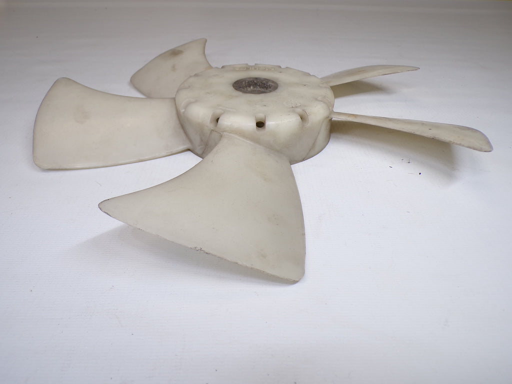 Used factory main radiator cooling fan blades for Early NA Mazda Miata. This is the main cooling fan white plastic blades that are attached to the driver side of the radiator. The plastic fan has five blades and attaches to the front of the fan motor with a nut. The fan activates when the temperature of the coolant reaches a certain level. Fan blades only. Motor, shroud, and hardware are not included. Fits 1990-1993.