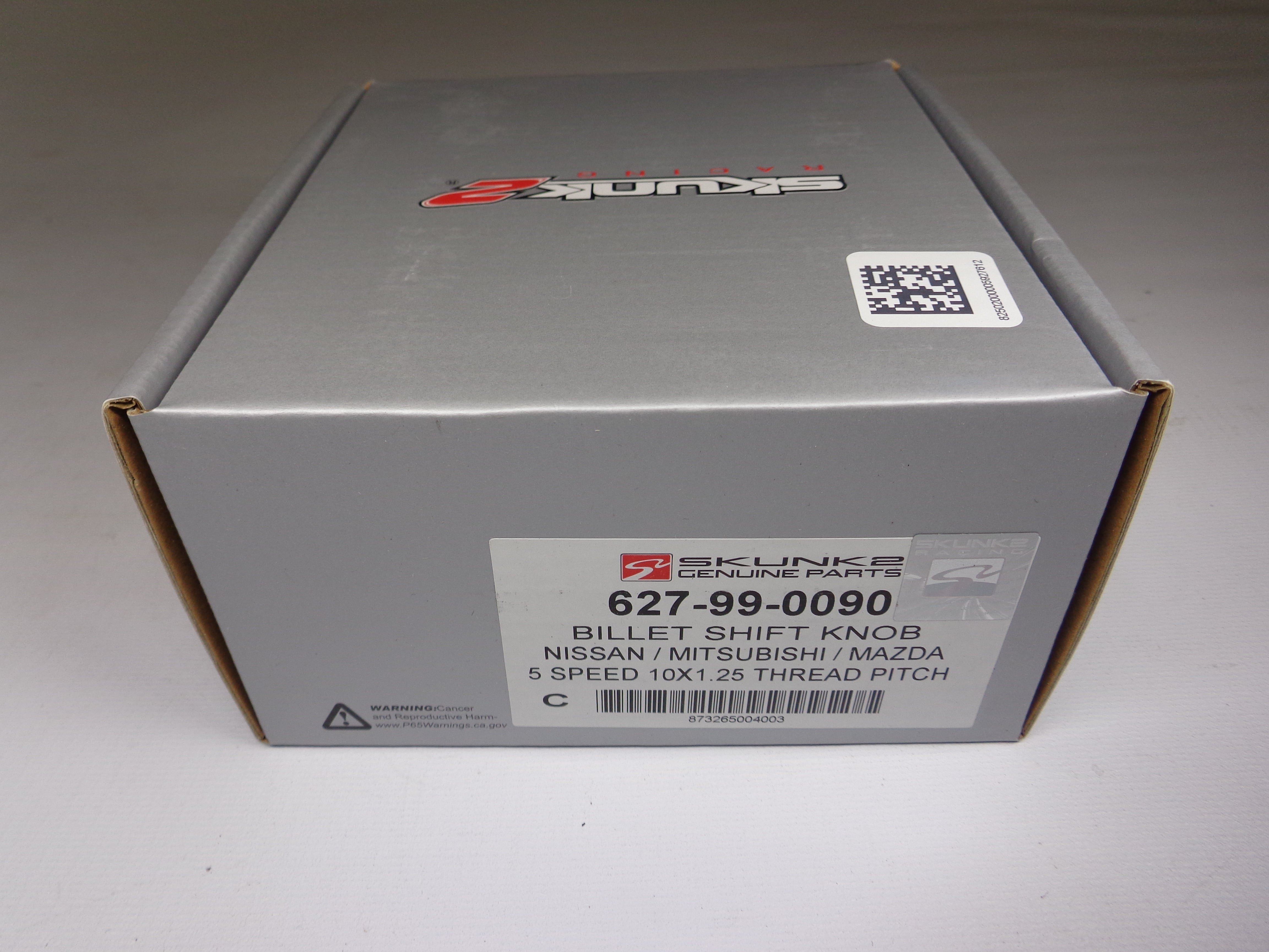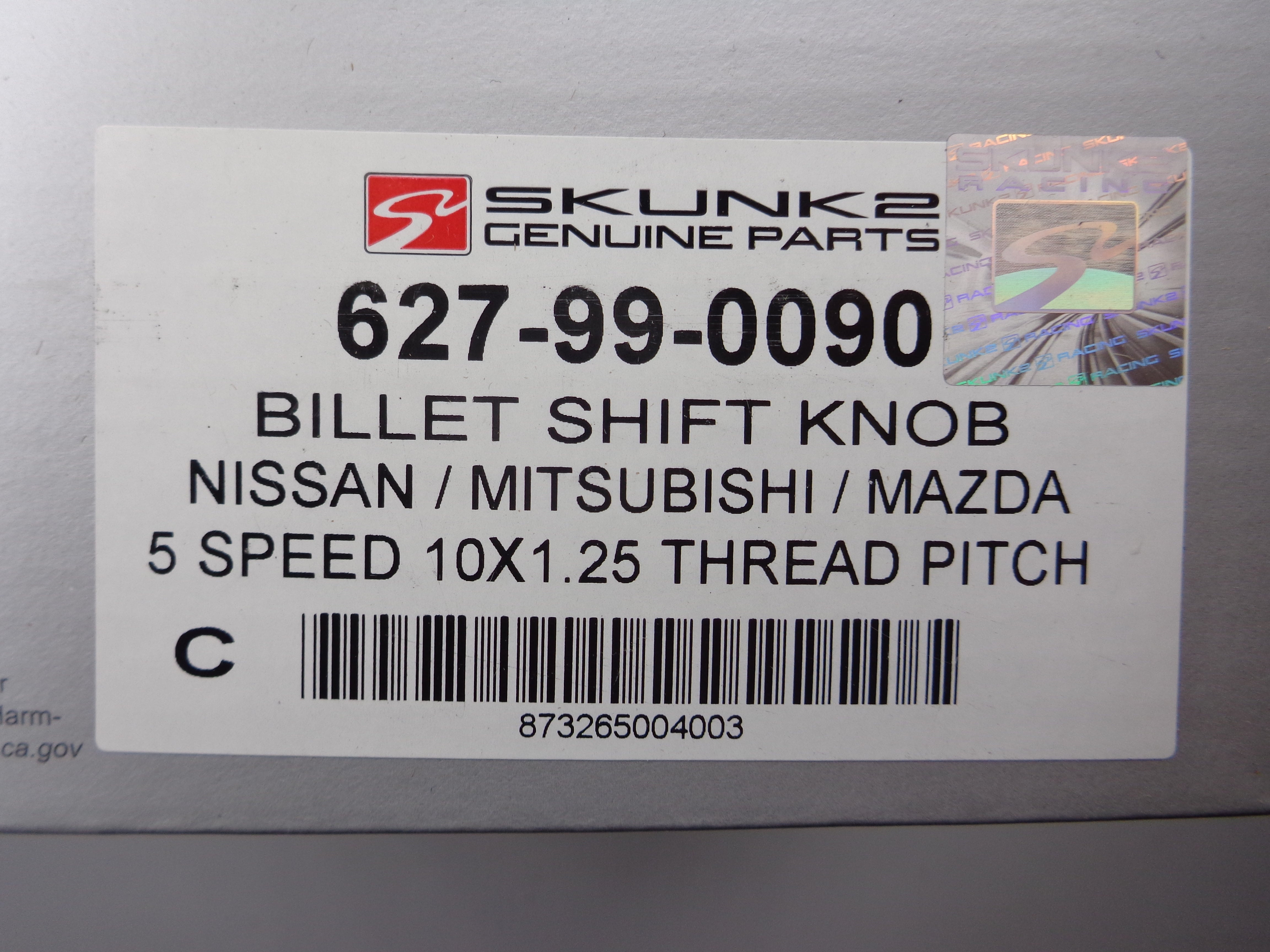 New aftermarket Skunk2 5-Speed Billet shift knob for NA and NB Mazda Miata. The Skunk2 5 Speed shift knob is made of billet stainless steel weighing around 440 grams. The shift knob has a PVD titanium coating that resists scratching and wear. The shift knob has a thread pitch of 10mm x 1.25mm. Part number 627-99-0090. Fits 1990-2005.