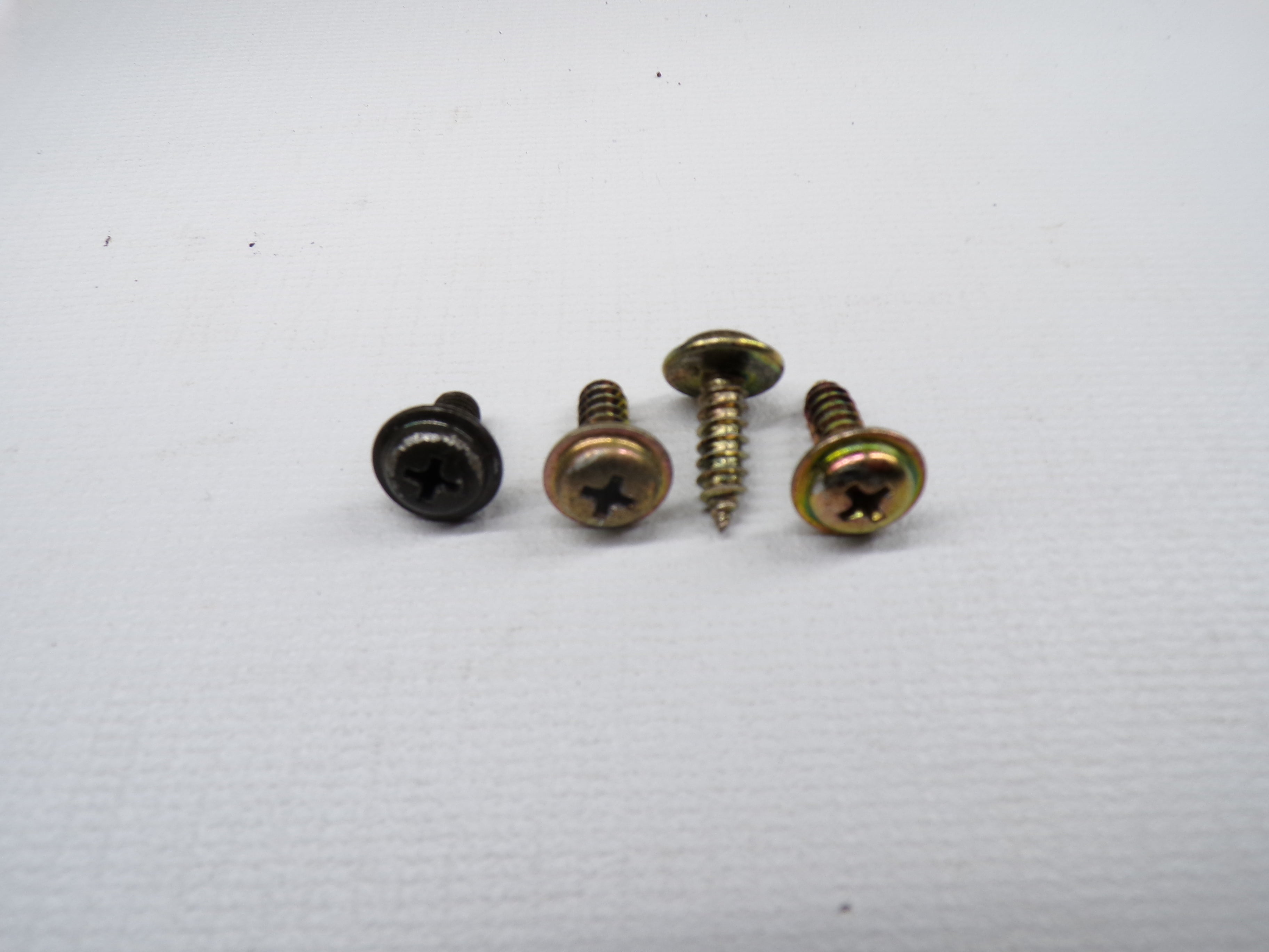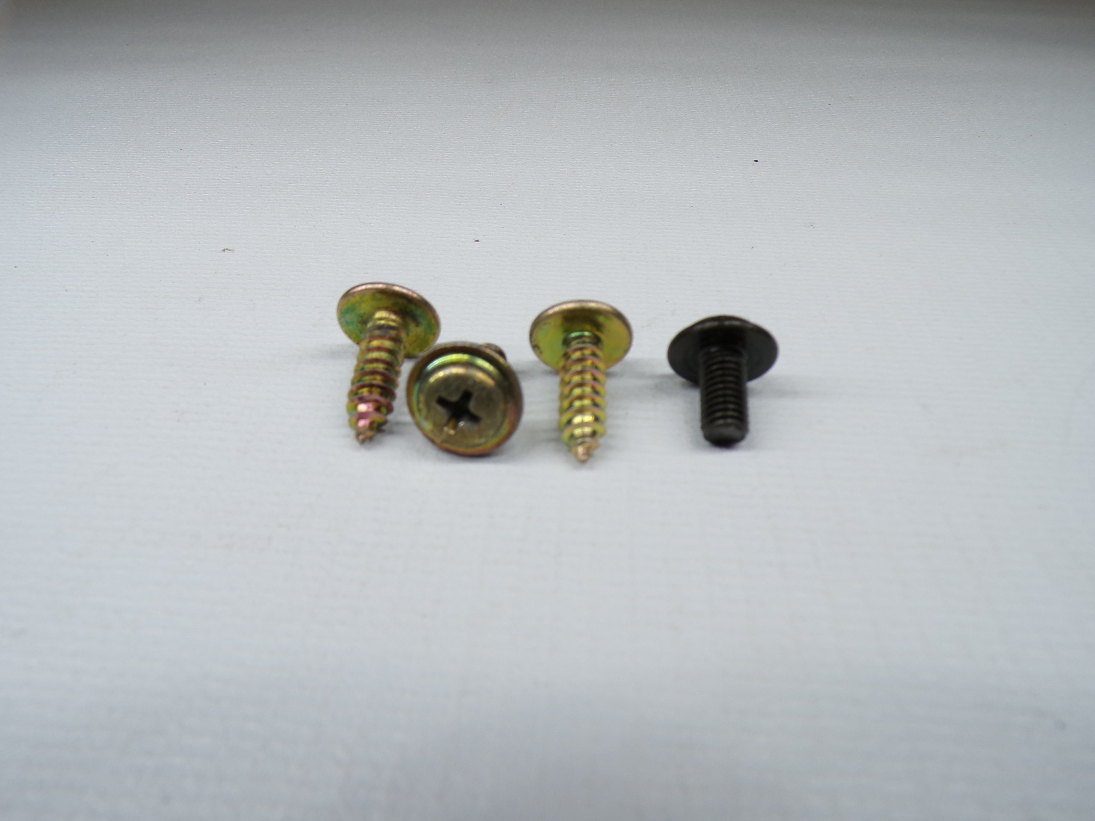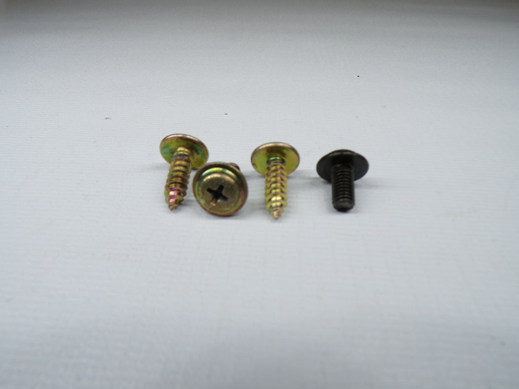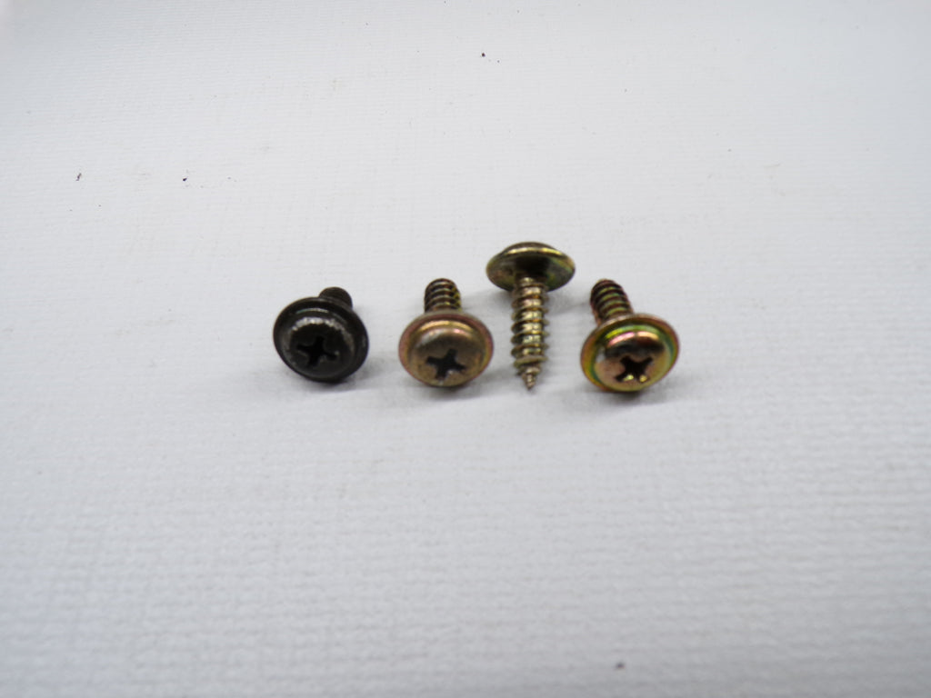 Used factory Mazda OEM steering column cover screws for Late NA Mazda Miata. These are the screws that hold the two plastic halves together that go above and below the steering column behind the steering wheel. Part numbers 9986-50-516 (three screws) and 9983-00-510B (one black screw). Hardware only. Fits 1994-1997. Sold as a set of four screws.