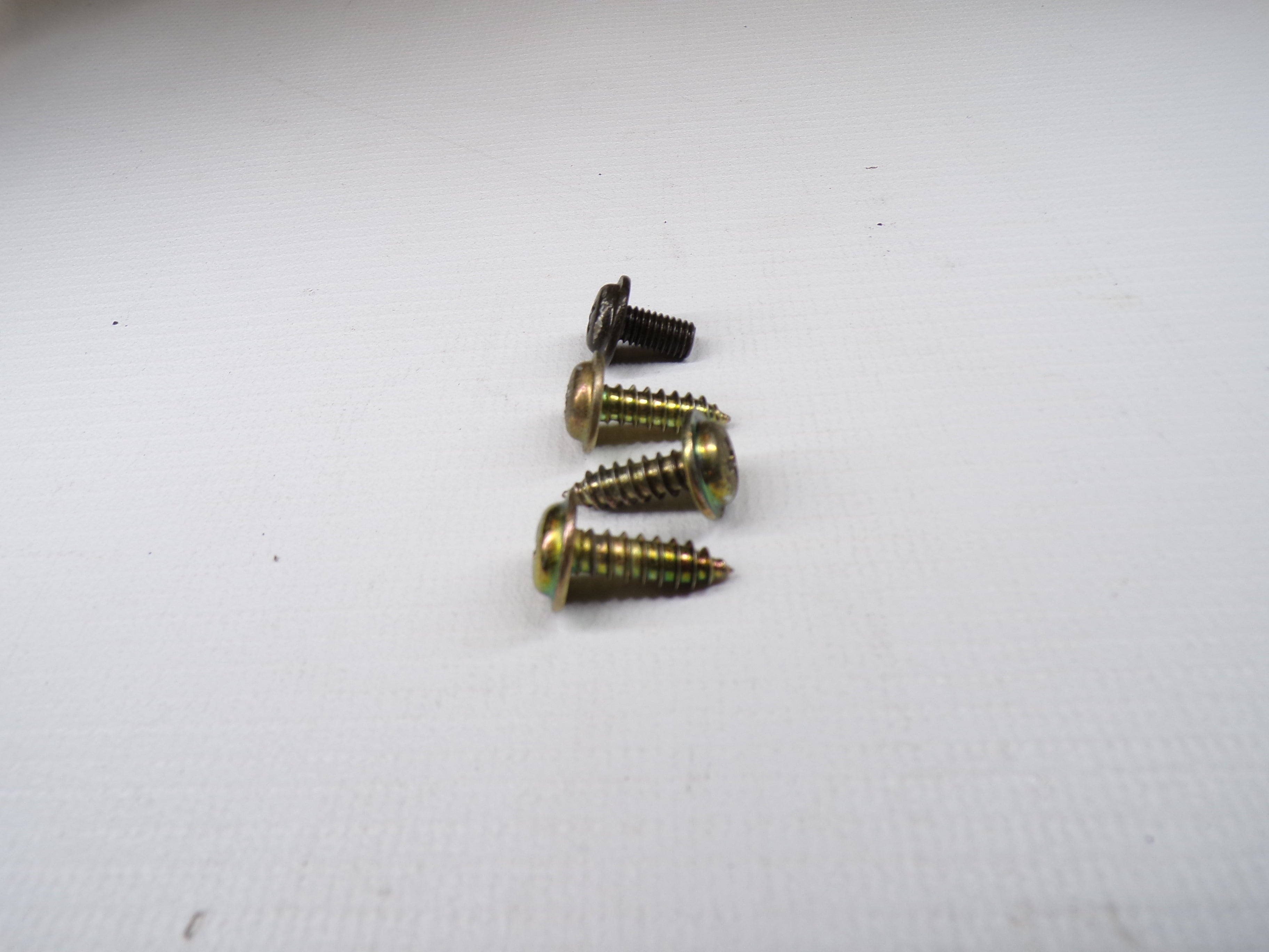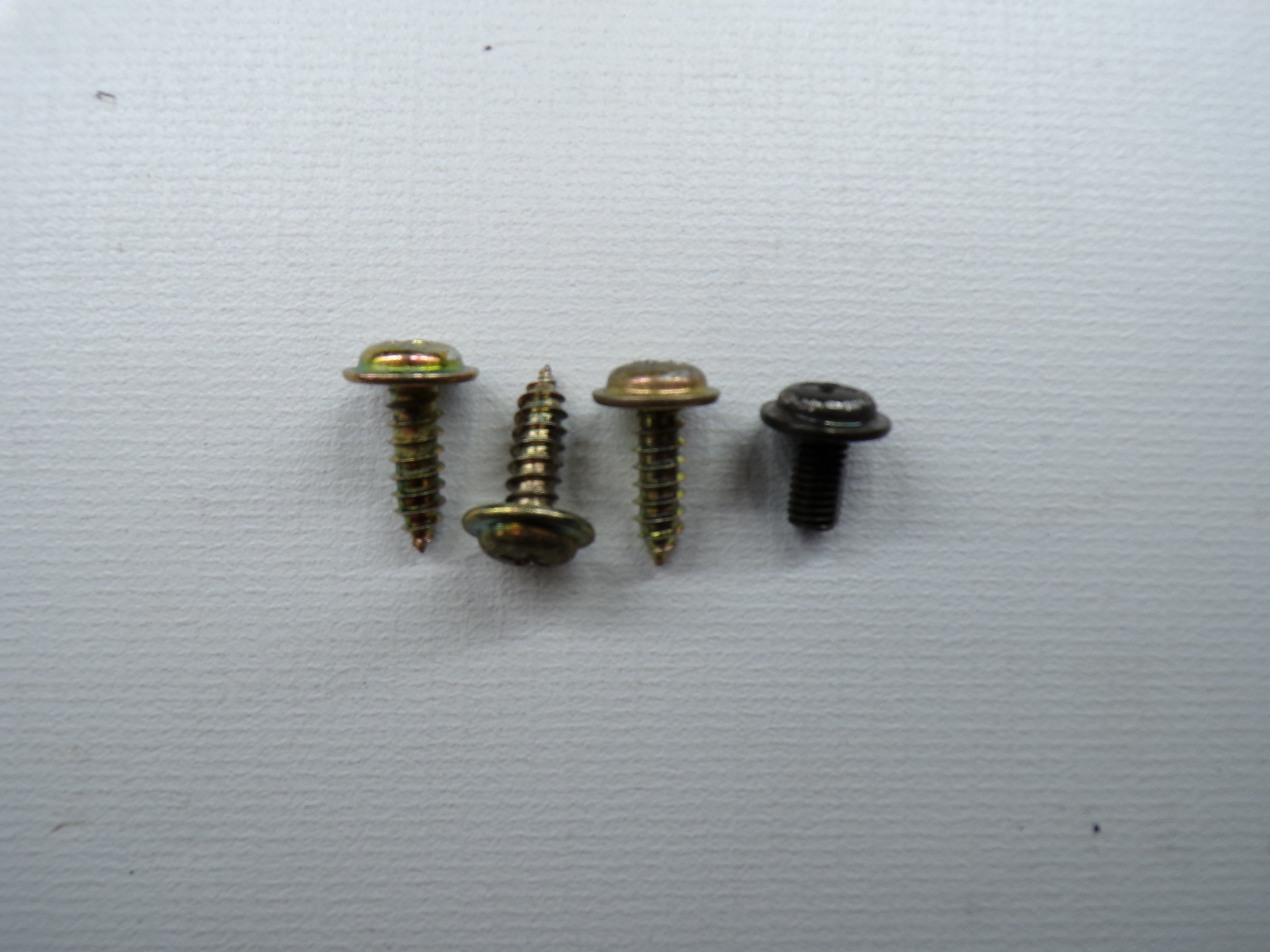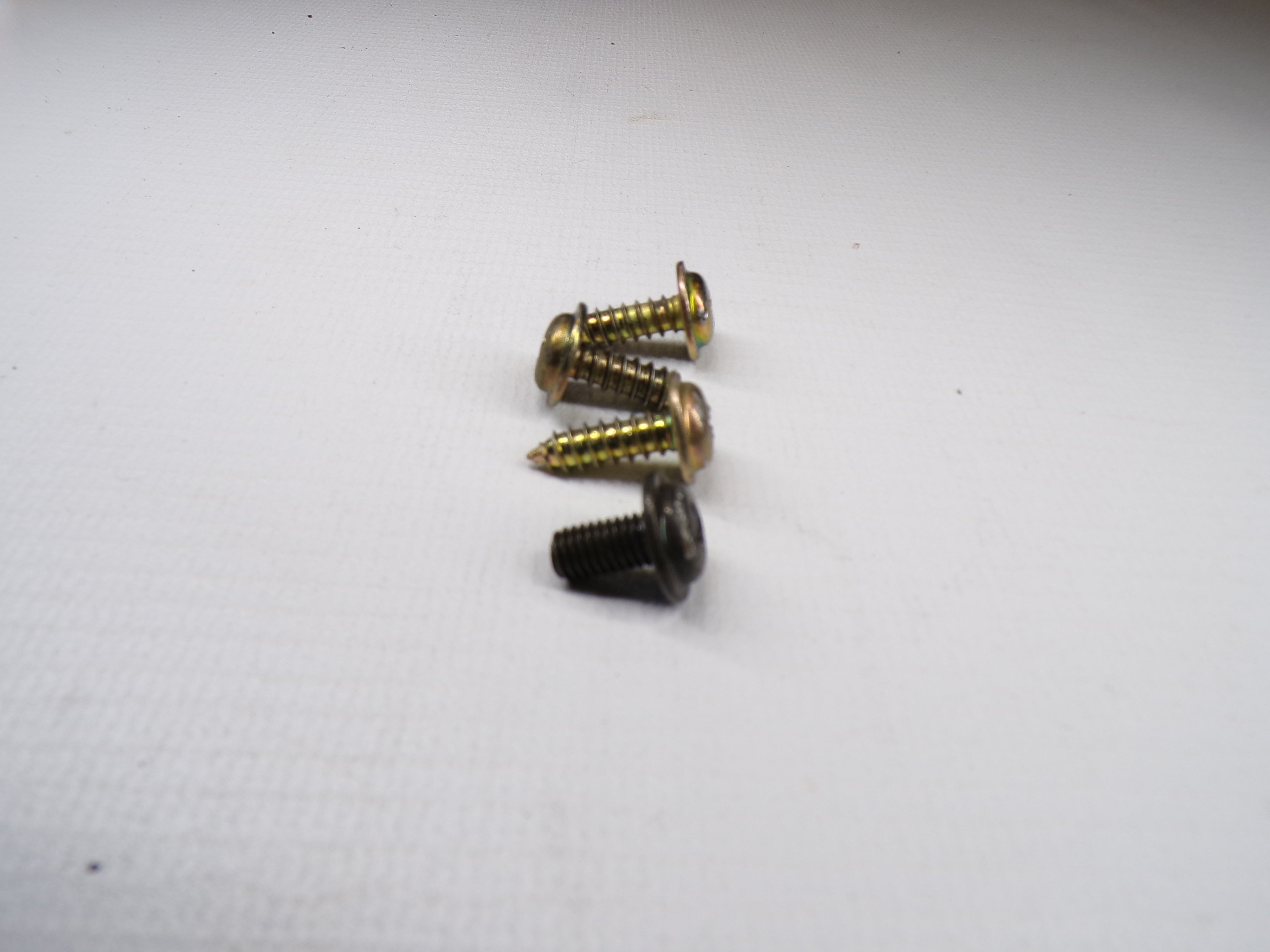 Used factory Mazda OEM steering column cover screws for Late NA Mazda Miata. These are the screws that hold the two plastic halves together that go above and below the steering column behind the steering wheel. Part numbers 9986-50-516 (three screws) and 9983-00-510B (one black screw). Hardware only. Fits 1994-1997. Sold as a set of four screws.